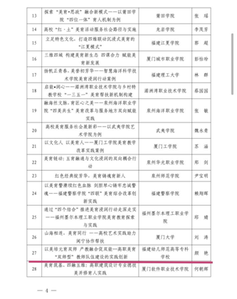 8月19日,福建省教育厅公布了2025年福建省学校美育浸润行动优秀案例评选结果。此次活动共收到各地各校报送的案例271个,经专家评审与网上公示,最终评选出优秀案例101项,其中高校案例43项。我校学前教育学院方琳宇老师牵头的《“crest”模型驱动:新时代学前美育生态链的创新实践》、艺术教育学院颜艳老师牵头的《以美培元育双师 产教融合促双能--高职美育“双师型”教师队伍建设的实践创新》,在与本科院校的竞争中成功入选。