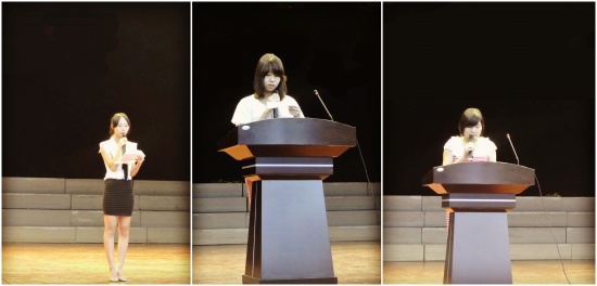 本次比赛采用现场抽号的方式。12级随机从各班抽取4名同学上台进行字词的测试,现场气氛紧张而热烈,台上展示的同学自信、镇定,相较于上学期抽号情况,12级整体进步明显,全面体现了日常训练的效果。11级口语抽号分为朗读与即兴演讲两部分,不仅考验了高年级普通话功底,也测验了他们临场的应变能力及普通话运用水平。初教中文专业方芳同学,以《我的业余生活——热爱阅读》为题的即兴演讲赢得了全场热烈的掌声。最后,姜平老师作了点评:首先,她肯定了近一年时间,同学们口语训练的成效,同时,她向全系提出了更高的要求:我系将实行"4 1"教学技能考核,即进行朗读、三字一画(钢笔字、粉笔字、美术字)、课件制作及说课或虚拟教学技能等4项教学技能基本功考核,展示1项文艺特长(从讲故事、舞蹈、歌唱、器乐、书法等项目中自选一项来展示)。