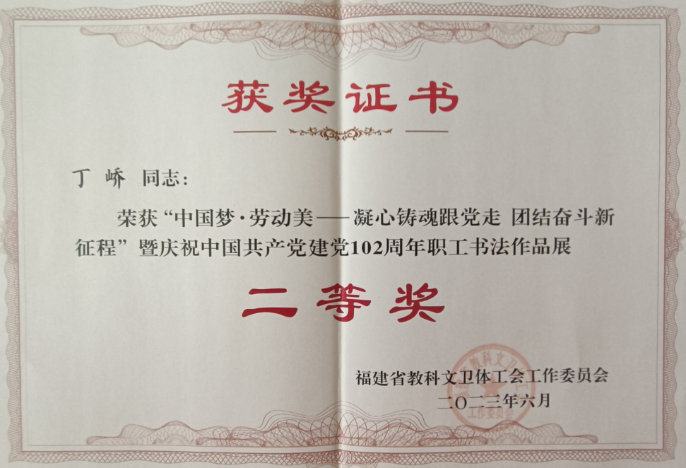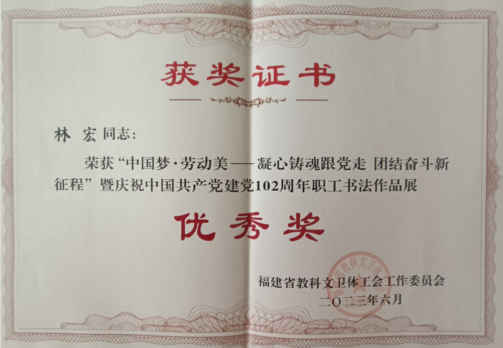 为深化学习贯彻习近平新时代中国特色社会主义思想主题教育,深入学习宣传贯彻党的二十大精神,积极参与福建省第七届职工文化节,激励直属单位职工为谱写中国式现代化福建篇章建功立业,2023年6月,福建省教科文卫体工会工委组织开展了以"中国梦·劳动美一一凝心铸魂跟党走 团结奋斗新征程"暨庆祝中国共产党建党102周年为主题的职工书法作品展。