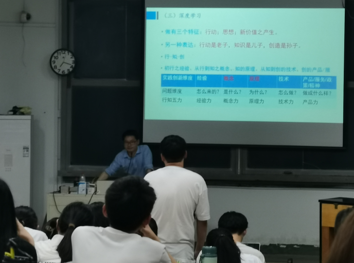 讲座中,周老师不断启发学生思考:知识和概念有什么区别?教学应该教知识还是教概念?怎么教概念?怎么教原理?增加劳动教育能培养创新人才吗?……一连串的发问和互动不时引发师范生的认知冲突,多次互动后,周老师总结指出,教学不应该只停留在经验层面,而应该努力培养概念思维、原理思维,实现从经验世界到理念世界的跃迁。“教知识会让人迷茫,教概念才能让人变聪慧”,师范生只有在充分领悟学科的概念和原理的基础上开展教学改革,才能在实践中培养真正有创造性的学生。