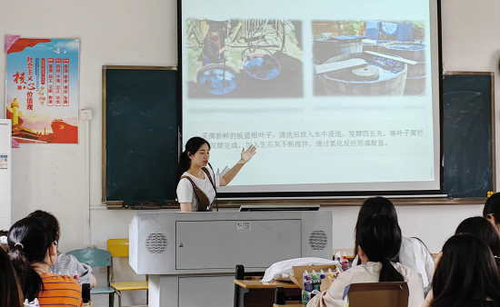 陈紫贞老师以提问形式导入,从小小的板蓝根既可入药又可制成天然染料,引出非遗文化——扎染艺术。陈老师让学生通过阅读文献总结古书中传统扎染技法的要点;接着通过对工具的介绍示范,让学生们初步了解扎染技艺。在实践阶段,积极鼓励同学们大胆创作,并在作品完成后进行分享展示与互评。同学们对这一传统布艺文化充满兴趣,积极动手,勇于尝试,敢于评价。老师们也兴趣浓厚地参与创作过程,与同学们共同体验扎染的趣味。