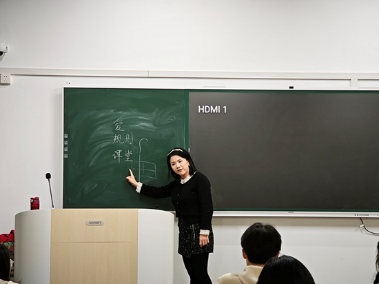 在讲座过程中,由于多媒体设备出现了故障,课件和案例视频都无法正常显示,梁老师不慌不忙,脱稿讲授,并用片段教学代替视频展示,身体力行地演绎了面对突发状况时的教学机智,并告诉同学们在真实课堂中不可避免会遇到停电、设备损坏等突发事故,课前充分的准备和课中的随机应变都是非常重要的。
