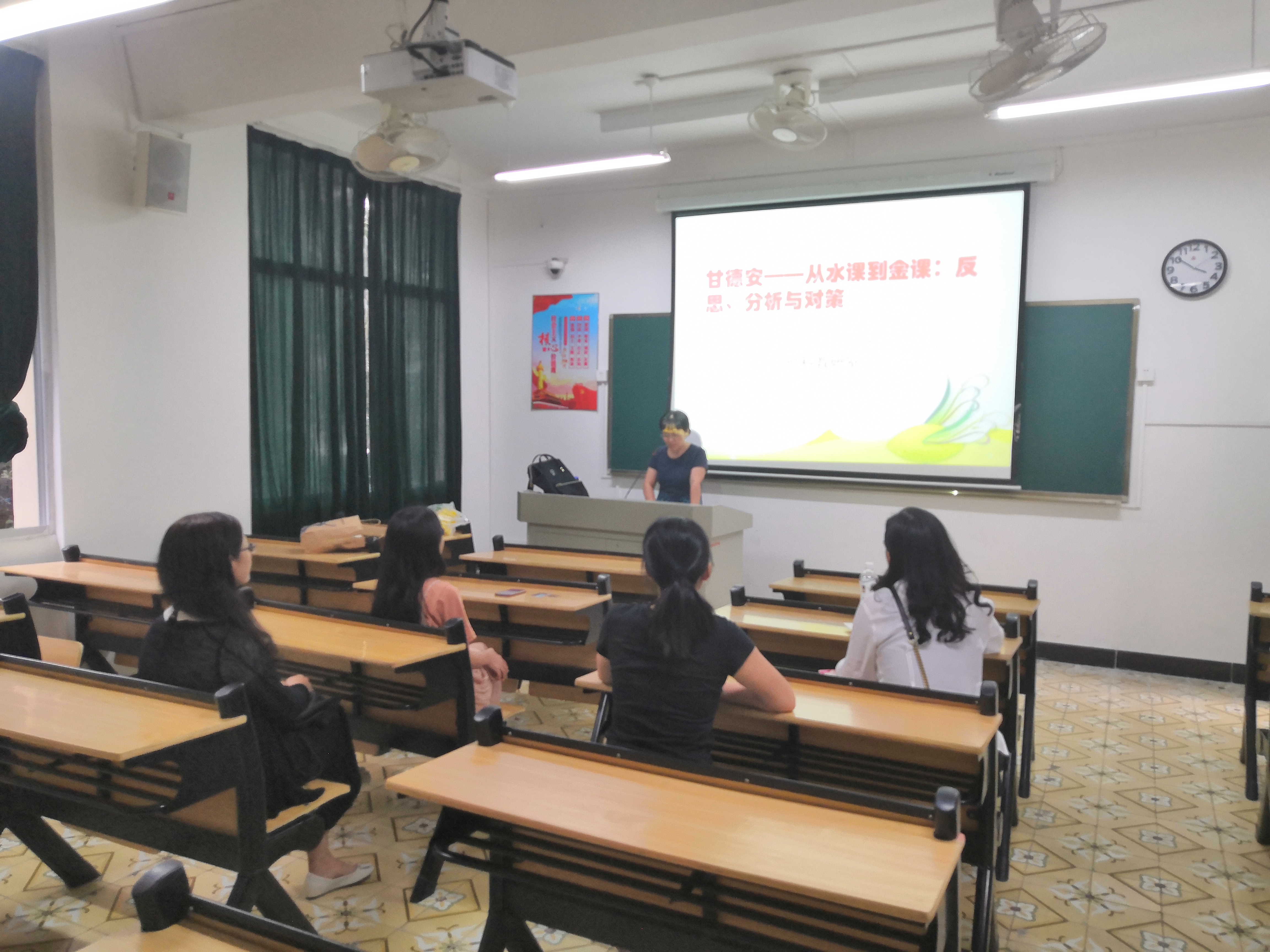 2019年10月18日下午,理科教研室全体教师在b栋教学楼203开展"消灭水课,打造金课"业务学习活动。在学习活动中,老师们认真学习了教育部高教司吴岩的《什么是"金课",如何打造一堂"金课"?》、教育部全国高校教师培训专家甘德安的《从水课到金课:反思、分析与对策》报告内容,以及《人文科学系关于组织开展"金课"评选活动的通知》。