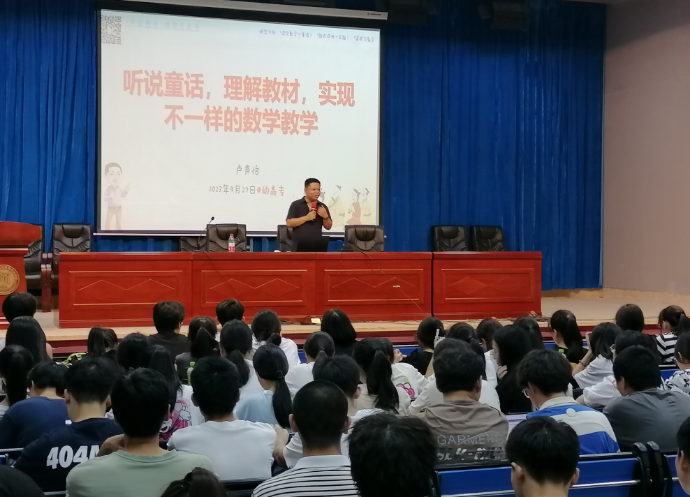 适逢小学数学教育专业大二的同学们开启新学期教研见习活动,而大三的同学们也将走出校门,开启为期10周的毕业实习,我院特邀鼓楼区教师进修学校卢声怡老师于9月27日晚在图书馆四楼报告厅,为师范生们开展"听说童话、理解教材、实现不一样的数学教学"专题讲座。