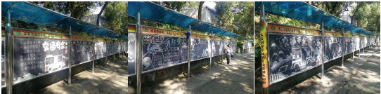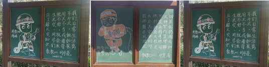 经过小先生们的同心协力,认真设计排版,用心收集资料,将童真的配图和精致的粉笔字相结合,使原本空白的黑板瞬间富有魅力。院办、师源广场和教学楼b楼随处可见我院学生关于该主题的训练及宣传作品,吸引了不少过路教师和学生的目光,成为了校园的一道亮丽风景线。