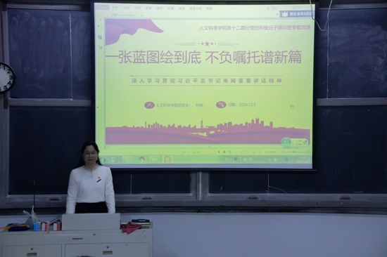 2024 年 12 月 3 日,人文科学学院第十二期分党校入党积极分子培训开班仪式在 b607 举行。人文科学学院党总支副书记、副院长林榕,院党总支委员、学生管理科科长何鹏,院党总支委员、学生第一党支部书记王艳如,院专职组织员黄洁钰和第十二期入党积极分子培训班全体学员共同参加了分党校培训开班仪式。此次开班仪式由黄洁钰主持。