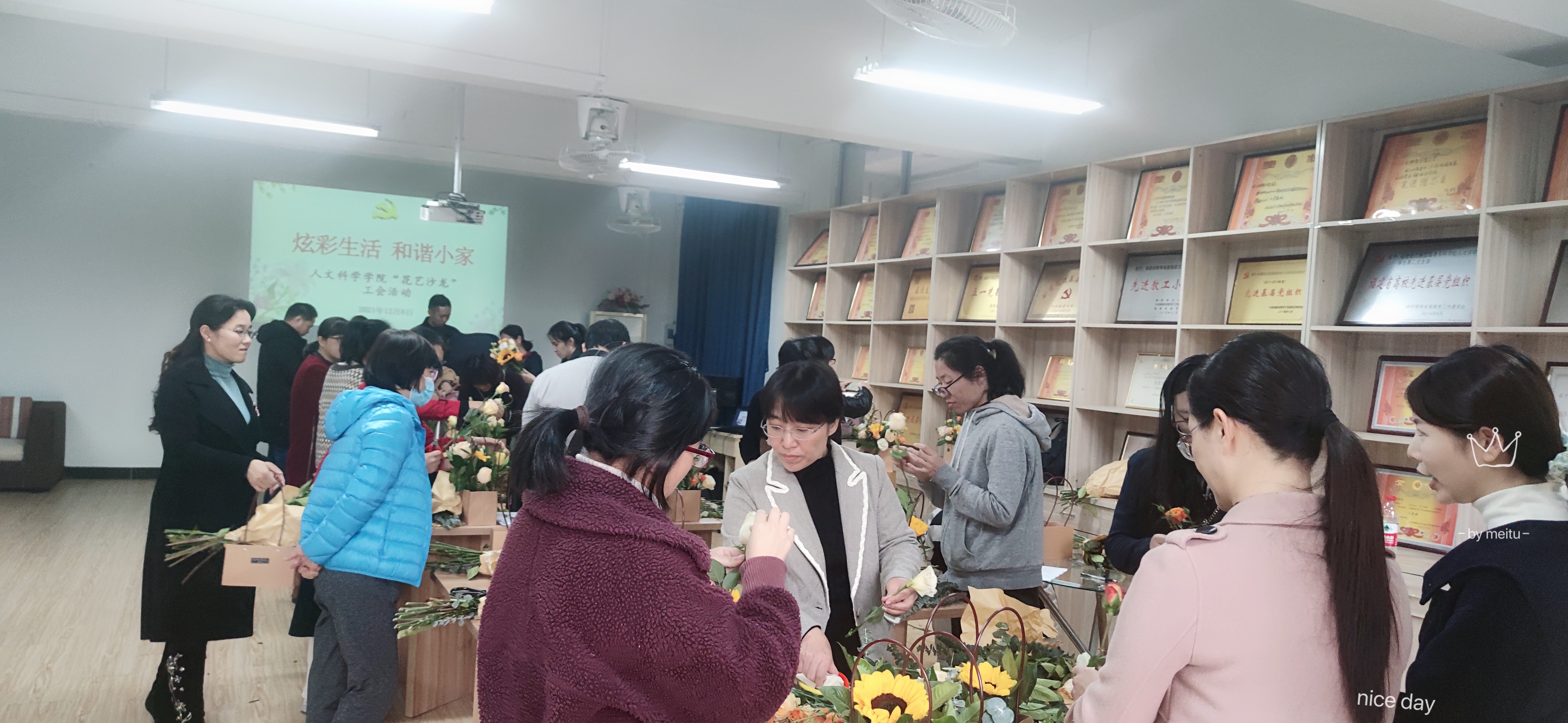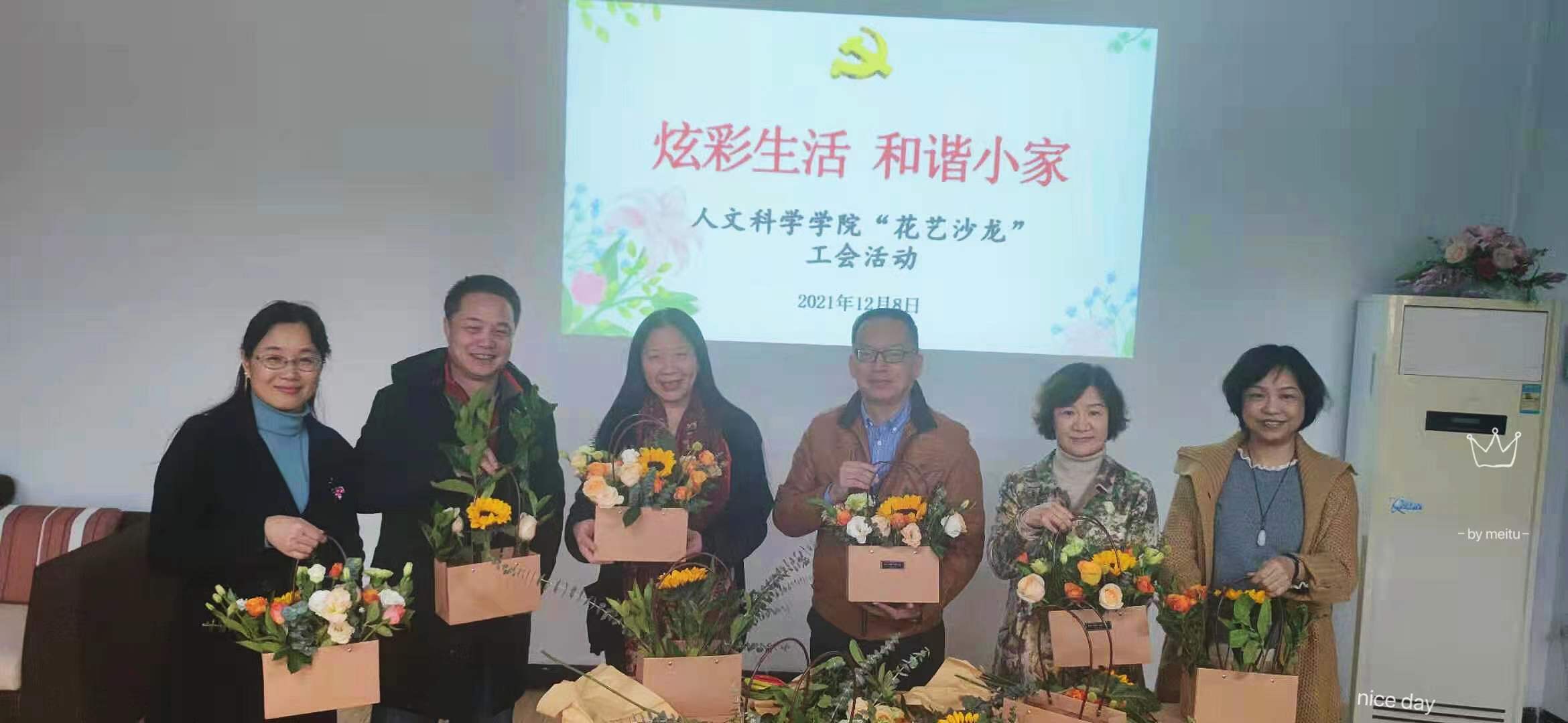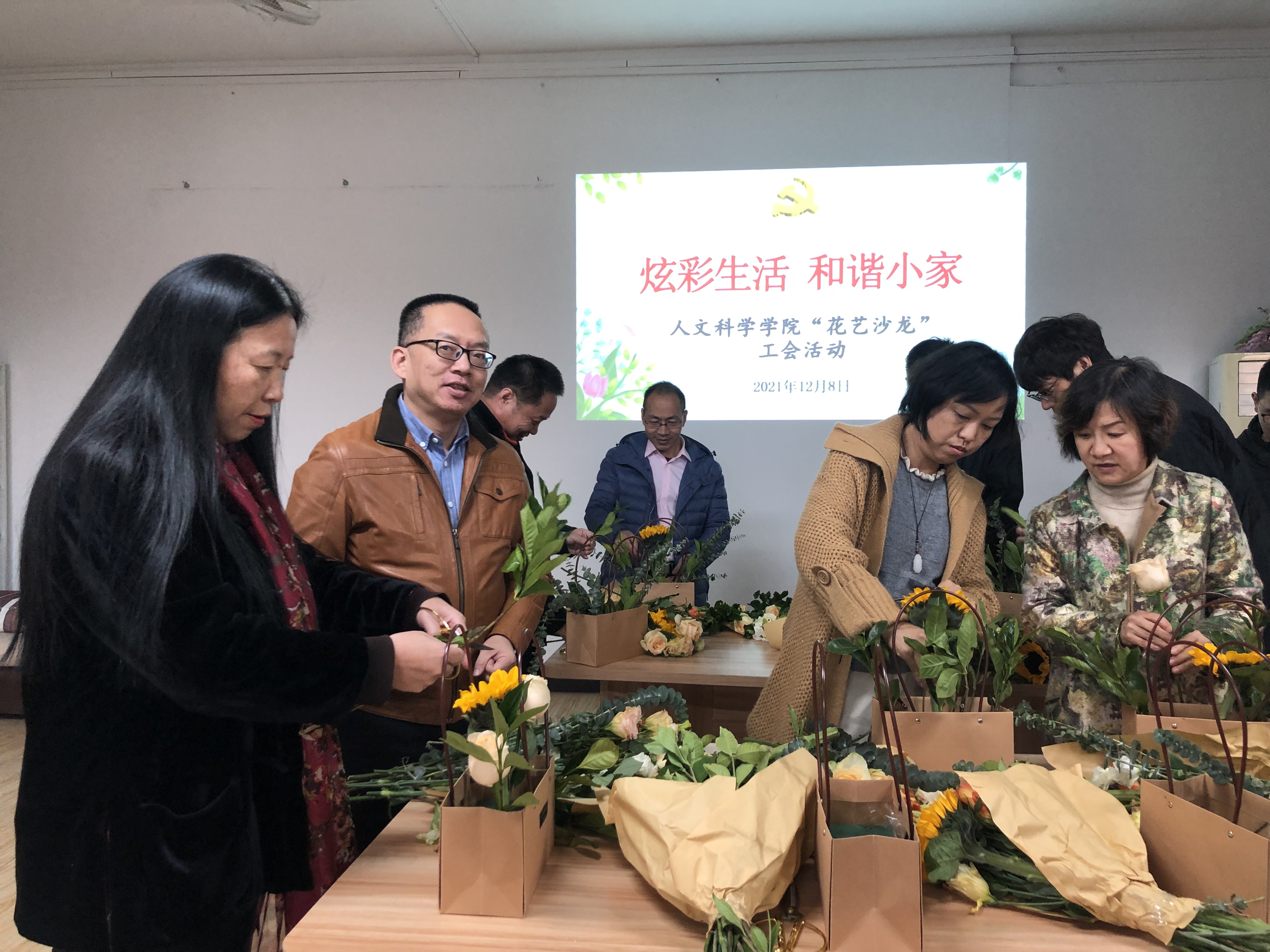炫彩生活,美好的希冀。为增强全院教职员工凝聚力,营造轻松和谐的工作氛围,加强交流,增进感情,培养教职员工的团队合作精神,同时让工会会员感受到工会小家的温暖和谐,12月8日下午,人文科学学院工会组织工会会员开展"炫彩生活 和谐小家"花艺沙龙工会活动,工会会员踊跃参与,校党委邹雄伟副书记、郑晓生副校长、校工会常务副主席管苇莅临活动现场关心指导。