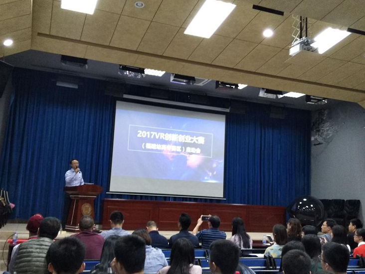 我系于2017年11月8日晚六点半整在校图书馆报告厅四楼隆重举行了vr创新创业大赛暨vr创新创业专题讲座。科教1711班、现教1711班、数展1711班到场参加了本次活动。莅临现场的有校党委李佳副书记、校科研处处长兼vr音乐指导程英老师、网龙网络公司美术总监葛岩、资深导演郭征、高级规划经理廖琼城、高级产品经理郑晖、高级项目经理林鑫杰等多位领导,同时也有校vr美术指导吴丽芳老师等多位学校老师到场参加本次启动仪式。