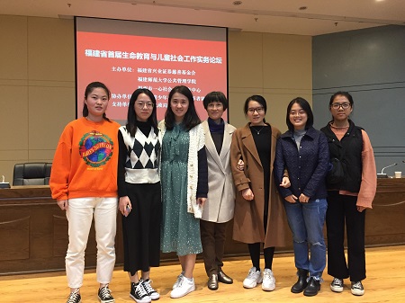 2018年11月2日, 福建省首届生命教育与儿童社会工作论坛在福建师范大学召开。我系彭妤、蒋小丽、王婧、何繁等四位教师及16青管专业学生代表参加福建省首届生命教育与儿童社会工作论坛。