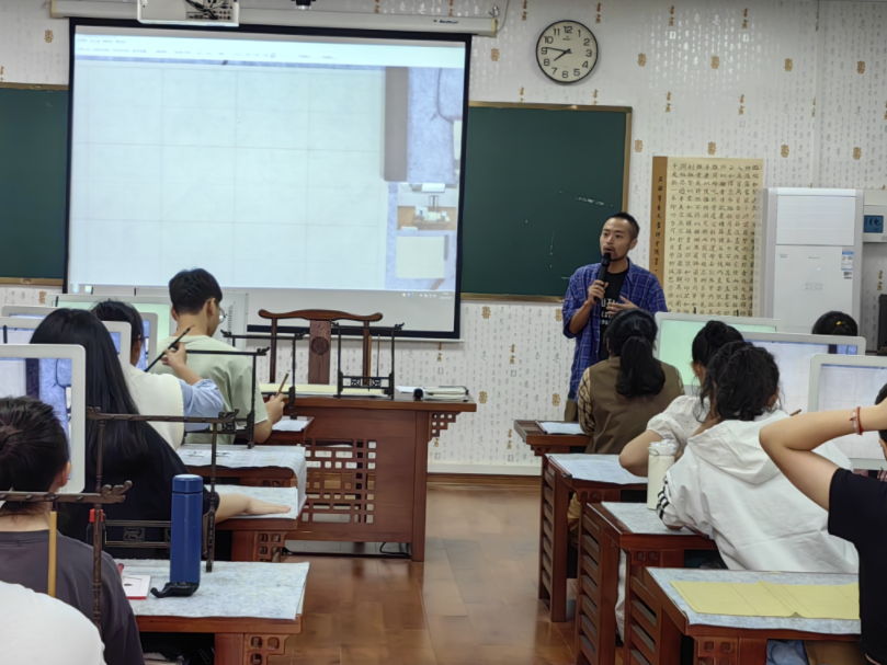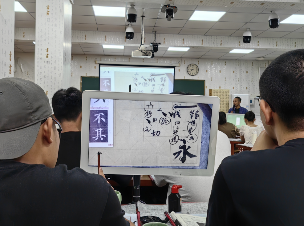 丁峤老师以一连串问题导入课堂,引发学生探讨,进而引出今天的教学重点:毛笔楷书中‘点’画的书写。随后,他从教材的范例中引导学生观察讨论和总结出“点”的结构形态,并对“点”的概念界定进行解读梳理,介绍汉字发展和演变中“点”的由来和演变,帮助学生掌握教材分析中关于点划的相关知识。在教材中点划书写教学部分,丁老师通过多媒体实时投屏直播等手段,精解点划在书写教学中应当注意的重难点,同时利用学生端视频直播实时投屏,对学生课堂书写情况进行讲解分析,引导学生结合教材要求,配合教学对象实际情况进行教学设计并深度思考如何将教材解读与分析结合到实践教学中,并展示了教学上的一些细节方法与经验。课堂教学中,丁老师注重挖掘课程思政元素,在教授点划书写技能的同时,引导学生领会体验中国书法艺术的美学思想与文化内涵。