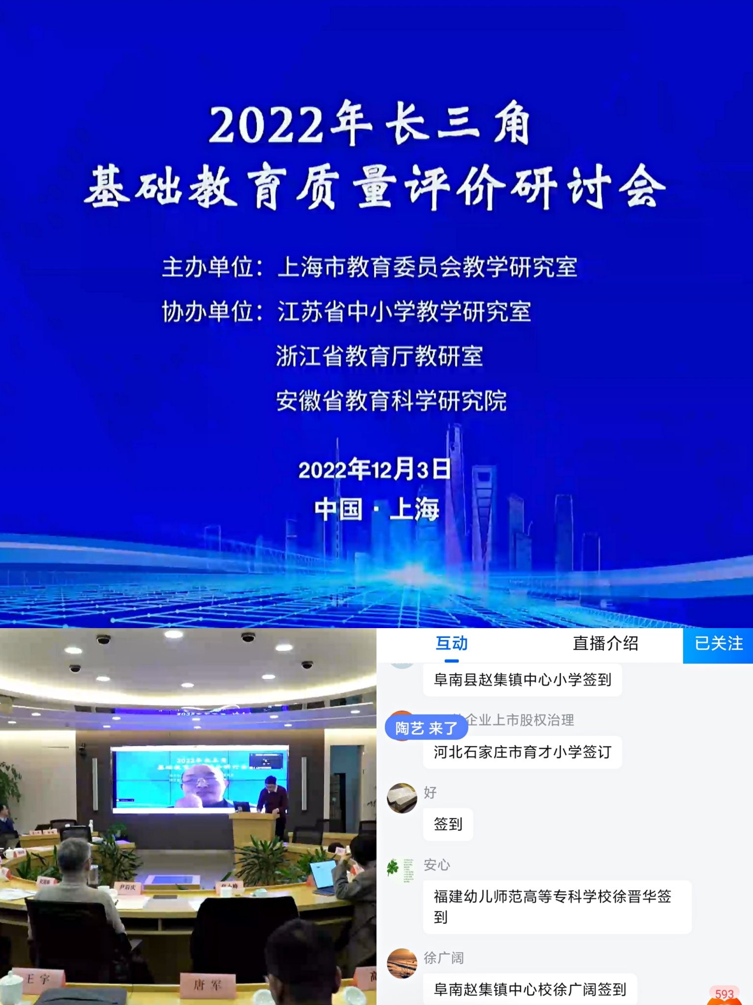 为深入贯彻中共中央、国务院《关于深化新时代教育评价改革总体方案》精神,进一步学习领会教育部等部门印发《义务教育质量评价指南》的精神实质和核心要义,2022年12月3日,人文科学学院利用周末时间,组织专任老师线上观看了2022年长三角基础教育质量评价研讨会。此次研讨会,是由上海市教委教研室主办,江苏省中小学教学研究室、浙江省教育厅教研室、安徽省教育科学研究院协办的线上教研盛会。