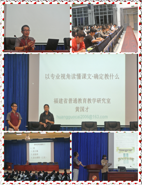 黄国才老师从我系学生的实际出发,为我系二、三年级的同学量身定做了一套备课方法——"一读、二想、三动手"。他认真、严谨的治学态度让同学们深刻地感受到了那句老话——"要想教给学生一滴水,自己要有一桶水"的深刻含义。黄老师的讲座为11级、12级中文专业的学生走向语文教师岗位提供了宝贵的经验和教学技巧。