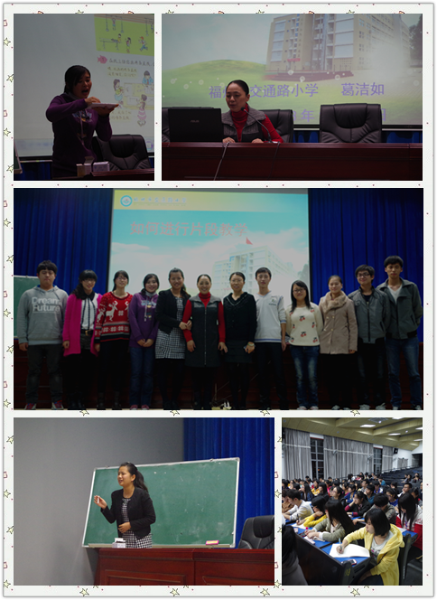 葛洁如老师首先阐述了读懂教材的意义,接着针对片段教学出现的问题,通过几个典型的案例,分析了在读教材时要如何理清教学重难点、确定教学目标、怎样应用教材主题图中的问题情境设计问题以及如何挖掘文本中的数学知识内涵和数学思想方法等。最后,葛洁如老师邀请两位小学数学老师为同学们进行了片段教学展示,并对这两节片段教学进行了点评。葛洁如老师的讲座使同学们深受启发,对如何实施片段教学有了更清晰的认识。