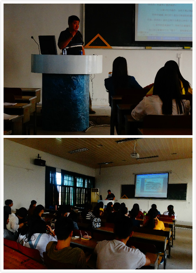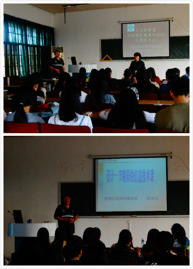为助力计算机专业的同学们将要开展的毕业教育实习, 10月13日下午2点,我系邀请福州鼓楼进修校的潘高峰老师于系办701带来题为《设计一节精彩的信息技术课》的讲座。2013级计算机专业的同学们听取了本次讲座。