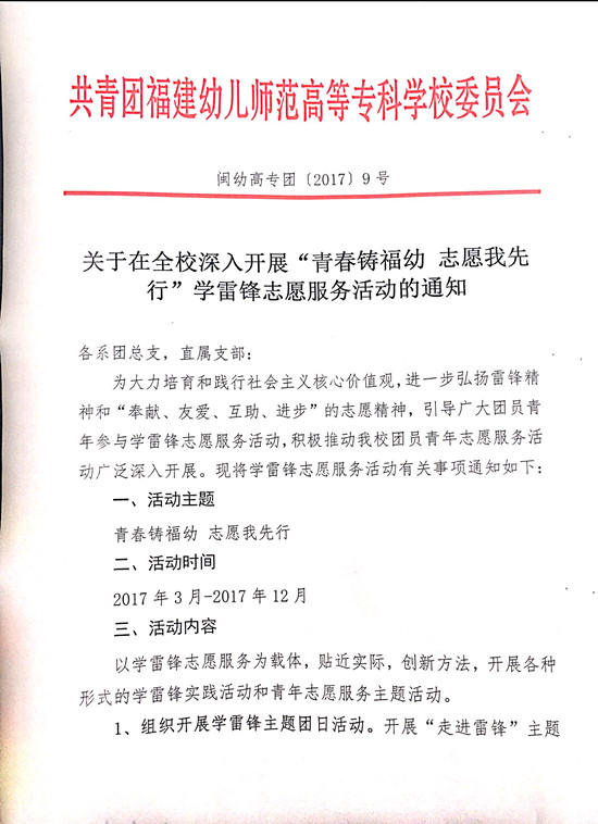 闽幼高专团〔2017〕9号关于在全校深入开展“青春铸福幼 志愿我先行”学雷锋志愿服务活动的通知-ag百家乐官网
