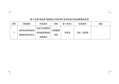 根据《关于开展第十五届“挑战杯”福建省大学生课外学术科技作品竞赛的通知》(团闽委联[2021] 3号),经学生自主申报,二级学院团总支推荐,校团委审核通过,拟推荐以下作品参加第十五届“挑战杯”福建省大学生课外学术科技作品竞赛,具体信息如下: