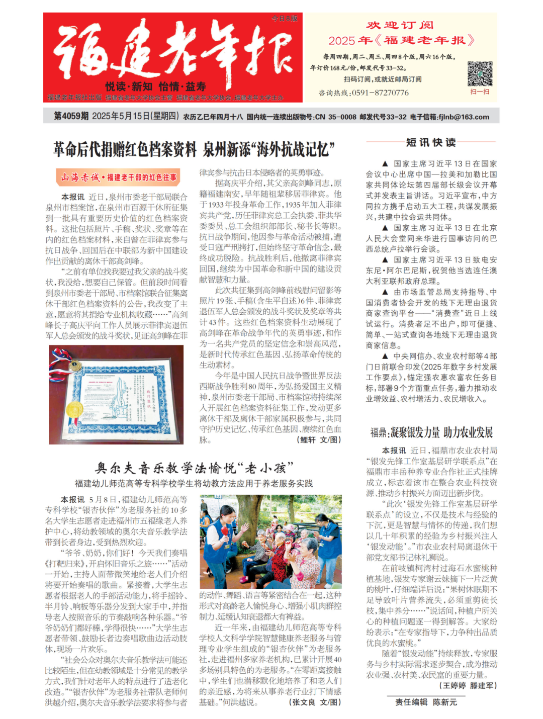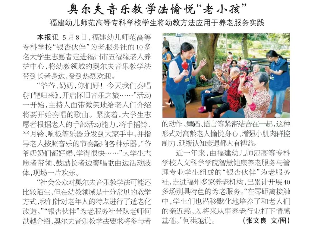 5月15日,《福建老年报》头版刊登《奥尔夫音乐教学法愉悦“老小孩”》一文,介绍我校学生社团“银杏伙伴”为老服务社的社会服务创新实践做法。