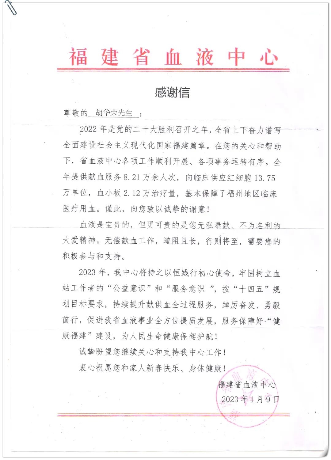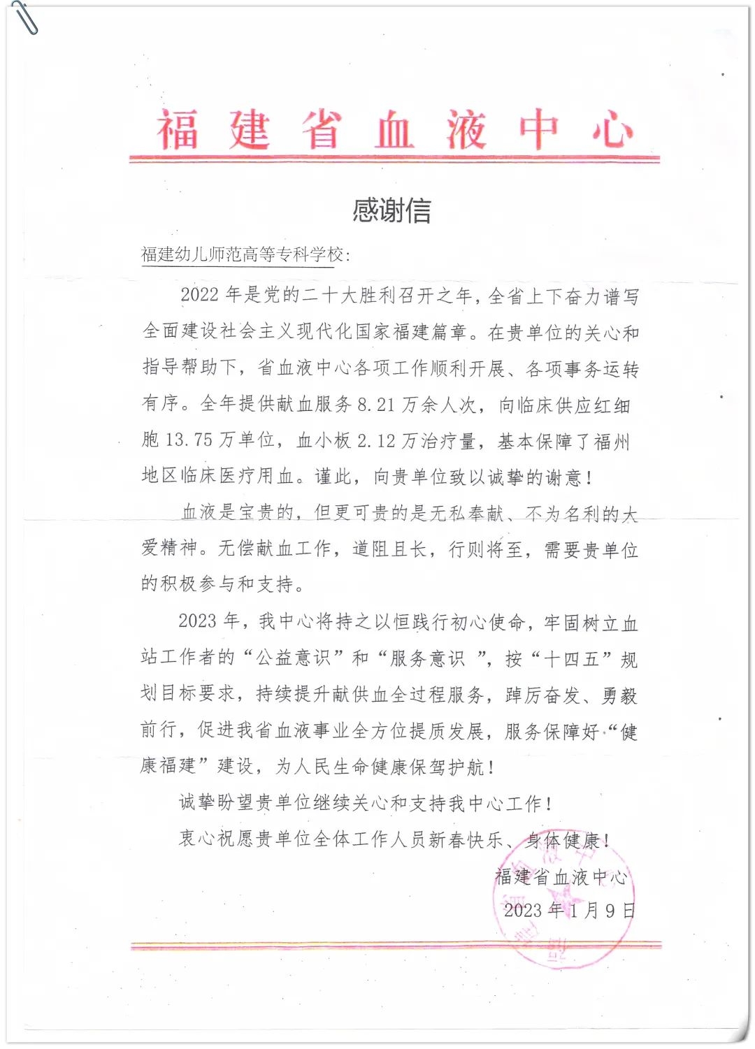 近日,福建省血液中心向学校和校团委书记胡华荣发来感谢信。向我校师生对无偿献血工作的支持表示感谢与赞扬。