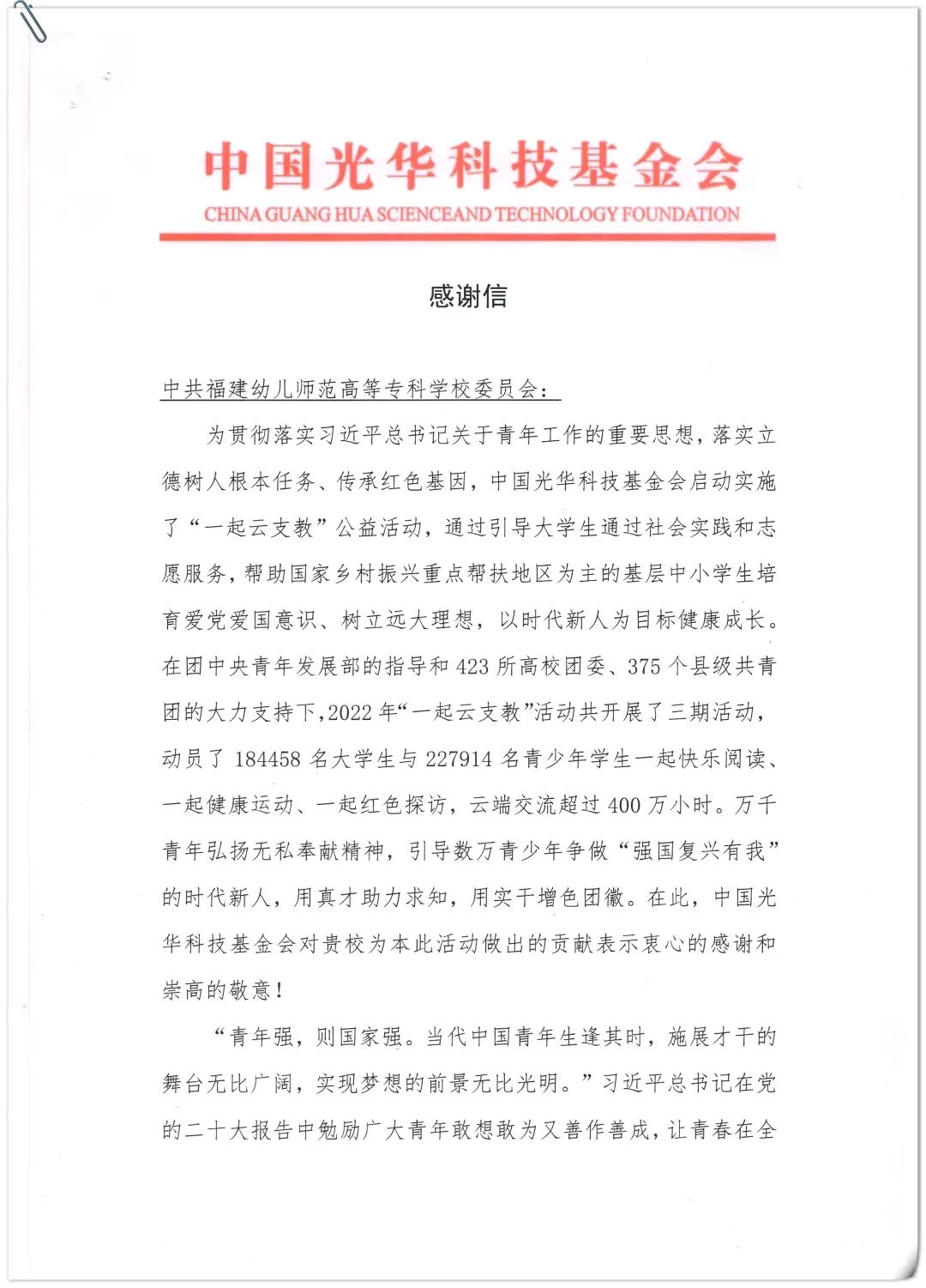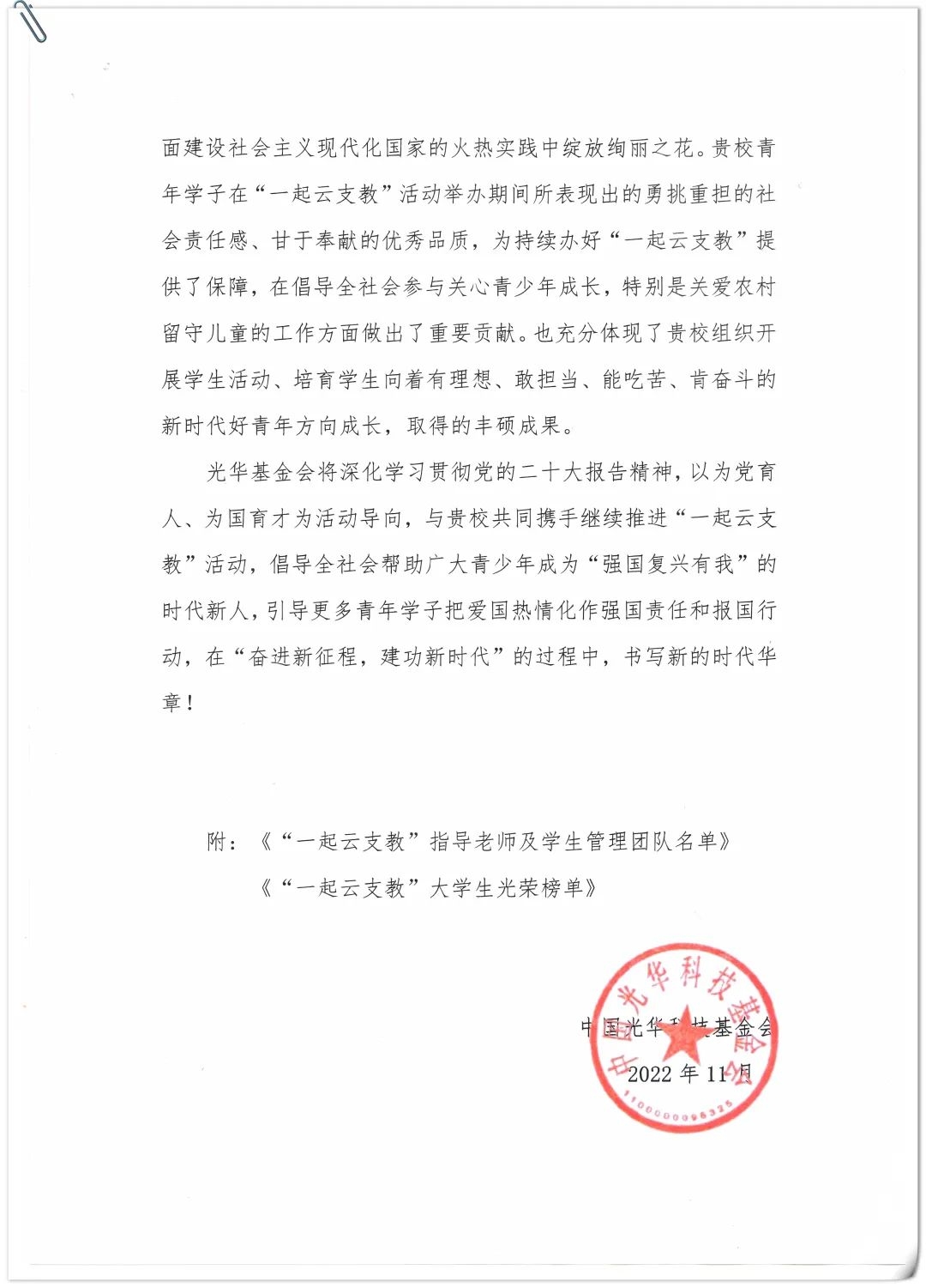 2022年暑假及2023年寒假,我校组织开展了由共青团中央青年发展部和中国光华科技基金会主办的 “一起云支教”公益活动。疫情和寒冬也阻挡不了大学生们与青少学生们一起云端学习的温情与暖意,引导青少年争做“强国复兴有我”的时代新人。为了表达对我校活动组织的谢意,活动主办方特别向校党委发来感谢信,为参与活动的指导老师和青年大学生们点赞!