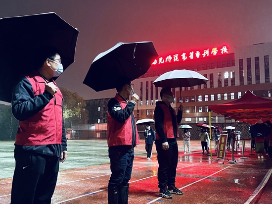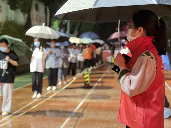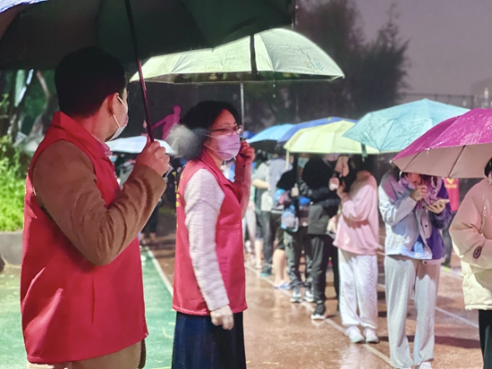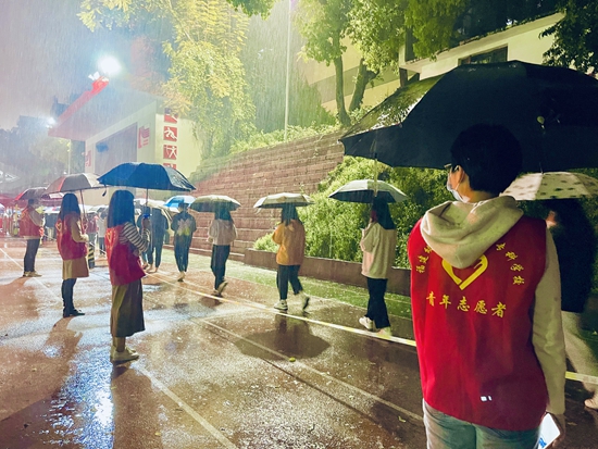 尽管突降暴雨,党员志愿者仍按时到达核酸检测现场,冒雨投入工作。他们帮助现场秩序维持、文明劝导、查验核酸检测码等。在党员志愿者的指引下,参检学生全程佩戴口罩,与他人保持1米以上间隔,快速有序完成扫码、登记、采样等流程。虽然大雨淋湿了衣服,但是党员志愿者们没有退缩,坚守岗位为检测工作平稳有序开展提供了坚实的保障。他们以实际行动助力疫情防控阻击战,共同守护师生群众身体健康和生命安全,让党旗在疫情防控一线高高飘扬。
