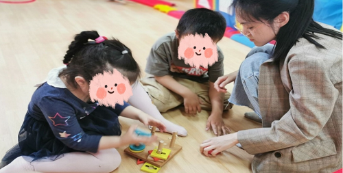 在感统教室里面,温柔腼腆的袁老师在帮助幼儿们尝试自己动手去解决问题,让幼儿感受自己解决问题的愉悦感。事后袁老师不禁感慨到:“时间如白驹过隙,不知不觉间就在慧童之家度过了一个多月的实习时光了。在慧童之家的实习期间,我学习到了很多的理论知识,学习到了很多处理问题行为的方法,也深深地感受到了慧童之家这个大家庭的温暖。”