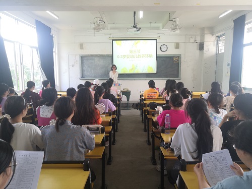 此次公开课围绕主题“0-3岁婴幼儿教养环境及其影响”展开,根据教学内容的逻辑结构以及学生已有经验,教师运用了具体讲解、视频案例以及教学现场丰富的照片。用理论联系实际的方式,帮助学生了解0-3岁婴幼儿教养环境在创设时的注意事项,师生互动和教学效果良好。