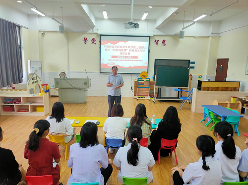 在喜迎建党百年之际,为响应党和国家对发展残疾人事业的号召,培养学生对特殊教育的职业认同和特教情怀,夯实学生的特殊教育专业技能水平,2021年6月23日,学前教育学院特教教研室开展特殊教育专业2020级“我的特教情”演讲比赛活动。特殊教育专业负责人王先达副教授,特殊教育教研室主任谢冰清及专业教师洪晓敏、焦静、张欣担任此次比赛的评委。