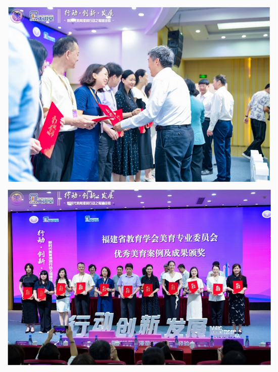 在上午举行的年会开幕式暨基础教育大讲堂上,一项重要的环节是表彰福建省美育浸润行动优秀案例。由方琳宇、寇灵慧老师共同完成的美育案例,在前期举办的“福建省美育浸润行动优秀案例征集评选交流活动”中脱颖而出,荣获“优秀案例”称号。方琳宇副教授代表团队上台领奖,中国教育学会常务副会长、教育部基础教育司原司长吕玉刚亲自为其颁发奖状。