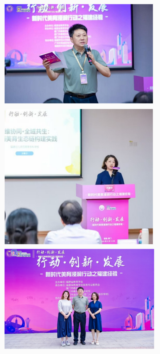 为深入贯彻党的教育方针,进一步推动福建省美育创新发展、展示美育成果并交流教学经验,福建省教育学会美育专业委员会于2025年6月12日在厦门市音乐学校(五通校区)隆重举办2025年学术年会暨基础教育大讲堂:“行动·创新·发展——新时代美育浸润行动之福建经验”活动。本次盛会汇聚了全国美育领域的专家学者,共同探讨新时代美育发展的创新路径与实践经验。学前教育学院、福建学前儿童美术教育研究中心团队成员陈秉龙、方琳宇、寇灵慧三位老师应邀全程参与,在多个核心环节贡献智慧、展示风采。
