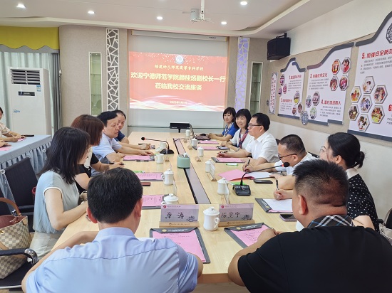7月1日,为进一步商讨学前教育专业“3 2”高职本科贯通人才培养相关事宜,加强两校在学前教育领域的交流与合作,宁德师范学院副校长颜桂炀带领教务处、教育学院相关负责人莅临我校参访交流。我校党委书记鲍仕梅,党委副书记、校长林伟川,党委副书记邹雄伟热情接待来宾。学工部、教务处、发展规划处、学前教育学院、附属第二幼儿园等相关部门、学院、直属机构负责人参加了交流活动。