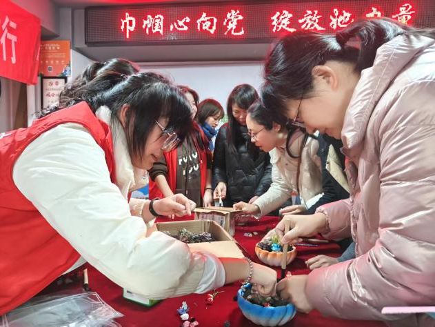 多肉的特质同“巾帼”相配,寓意着坚韧顽强。在志愿者们的指引下,大家纷纷拿起diy的小工具,从铺设营养土到栽培绿植多肉,一个个花盆内,多肉、小绿植、沙土、石头以及小蘑菇、小动物正被一双双巧手精心打造着自己独一无二的小花园,既养眼又美观,在制作盆栽中也体现了女性们对生活的无限热爱。