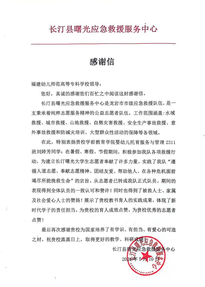 2024年4月,刘婷芳同学向长汀县曙光应急救援队提交了《关于“新鲜血液”注入申请书》,经过队内领导多次审核与讨论,同意成立长汀曙光大学生志愿者服务队。2024年五一假期,刘婷芳同学带领长汀大学生志愿者参与卧龙书院、水上汀江、横岗岭、三元阁等地的安保活动,保证假期期间游客的出行安全,维持景点的正常秩序,配合交警疏导交通,提供引导与帮助,以及城市安保巡逻,为外地游客、本地居民送上最温暖、最体贴的服务。