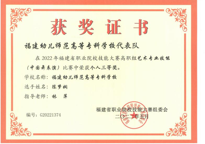 2022年福建省职业院校技能大赛高职组艺术专业技能(中国舞表演)比赛获个人三等奖
