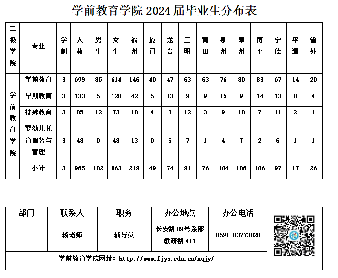学前教育学院享有“闽幼正源”美誉,百年矢志师范教育,深耕学前教育,校友英才辈出,福建省大多数园长、幼教学科带头人、骨干教师均毕业于我院。全省幼教界9名“杰出人民教师”中,7人毕业于我校;23名正高级幼儿教师中,14人为我校校友,上百名校友获得全国优秀教师、五一劳动奖章、省劳动模范和优秀教师等光荣称号,毕业生成为全省学前教育主力军。