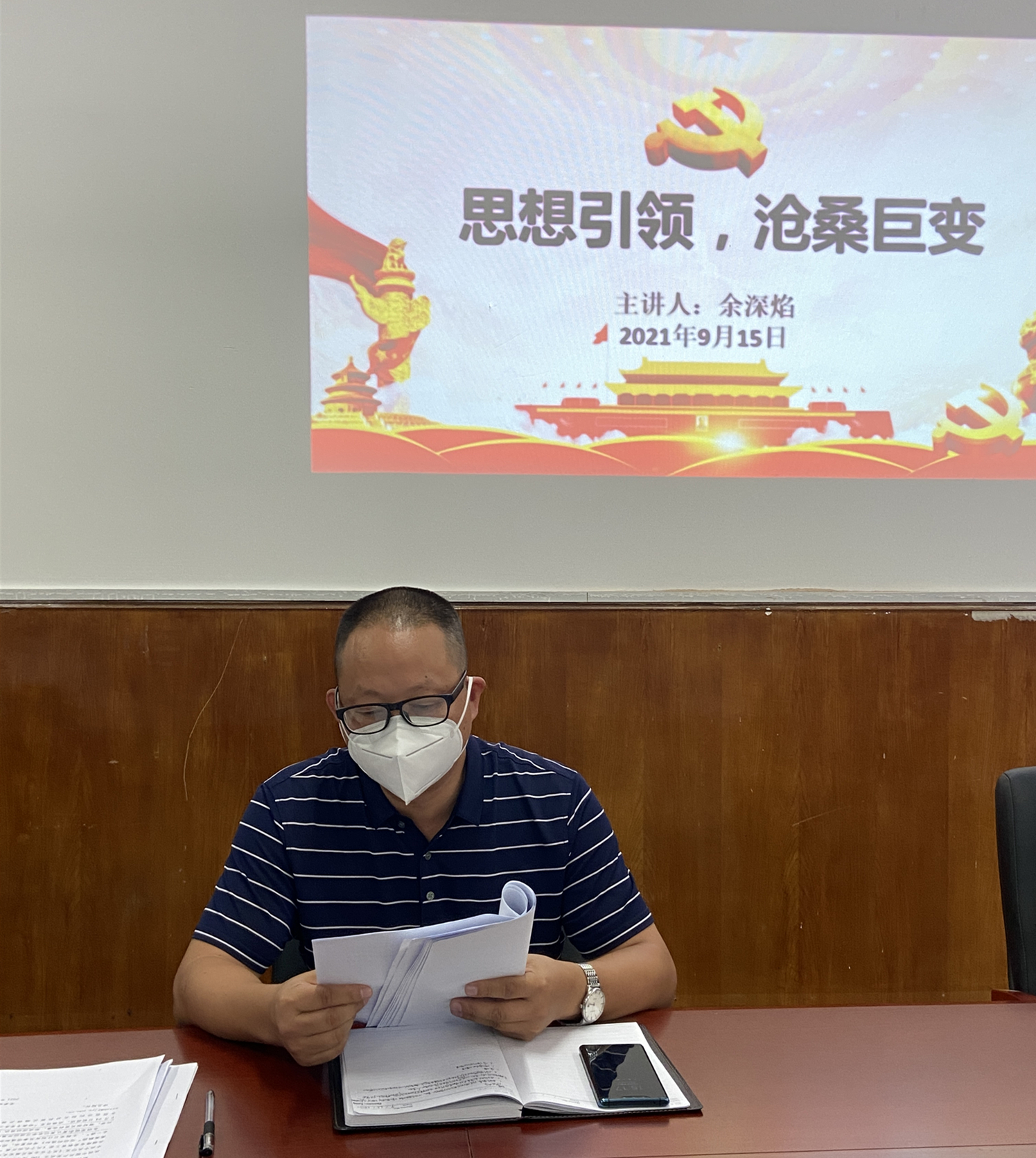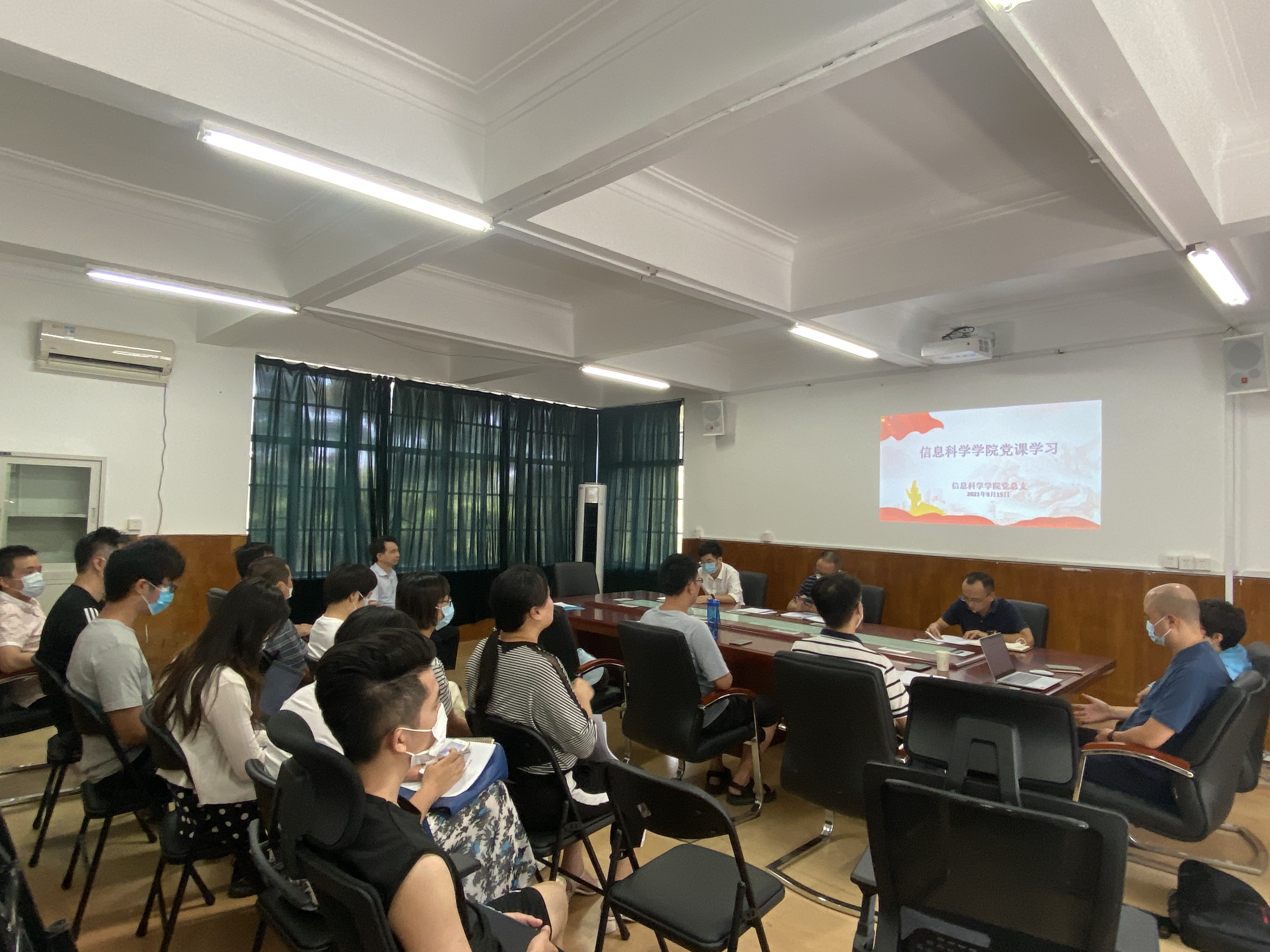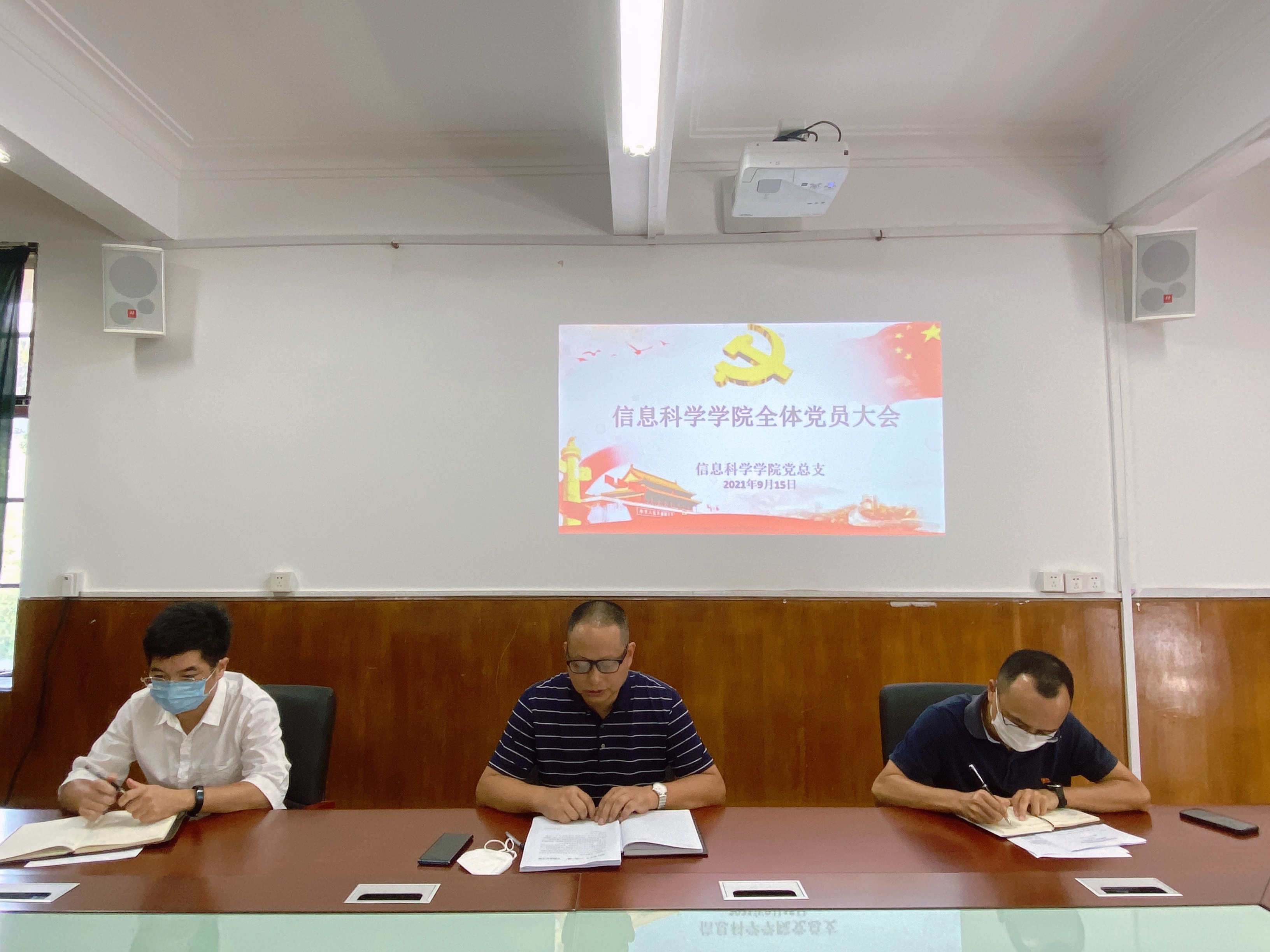2021年9月15日下午,信息科学学院党总支召开全体党员大会。大会共有三项议程:一是信息科学学院党总支书记余深焰宣读《关于姜琪等27位同志党组织关系内部转移的通知》,宣布信息科学学院党总支党员名单。他指出建立信息科学学院党总支、选举党总支委员等工作迫在眉睫,刻不容缓。接着,他宣读了《福建幼儿师范高等专科学校关于强化疫情防控期间学生管理有关事项的通知》、《新冠肺炎疫情防控专题工作会议纪要》等文件,鼓励党员志愿服务深入到抗击疫情一线。会上,余深焰书记高度赞扬了信息科学学院党员教师"学党史、践承诺、见行动"党员志愿服务送餐行动。二是陈宁华院长传达9月13日省教育厅党组书记、厅长林和平在全市教育系统疫情防控工作专题会议上的讲话精神。他强调,面对疫情我们要克服松懈心态、麻痹思想,做好充分准备。学生非必要不外出,老师们要多关心学生心理健康,并对班主任、辅导员提出了相应的要求。三是开展党史主题的党课学习,陈宁华院长分享革命先烈叶挺的事迹,号召党员同志向先辈学习,在疫情面前展现党员的先锋模范作用。余深焰书记做了题为《思想引领,沧桑巨变》的分享,与大家一起回顾毛泽东、邓小平、习近平三位伟人的伟大事迹、思想等,并推送人民网的相关资料给各位教师党员,督促各位同仁常学习。
