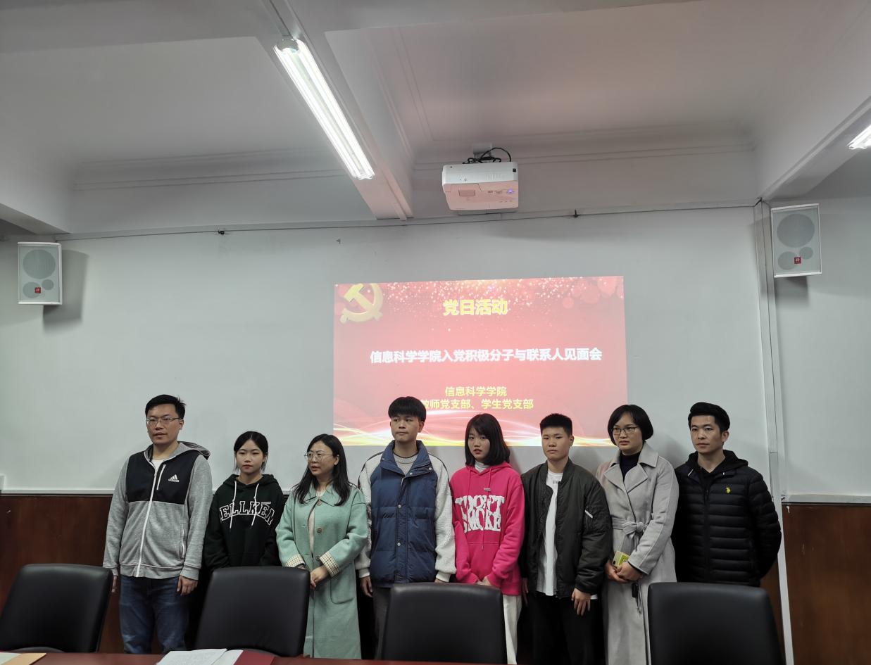 为深入弘扬爱国主义精神,学习十九大精神,加强学生入党积极分子政治思想建设, 2022年1月4日,信息科学学院教师党支部、学生党支部在院办309会议室举办"传承红色基因,赓续红色血脉,集聚红色力量"--2021下半年入党积极分子和联系人教师见面会活动。