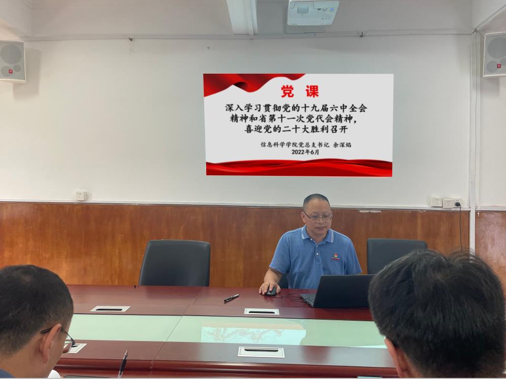 为深入学习贯彻党的十九届六中全会精神和省第十一次党代会精神,喜迎党的二十大胜利召开, 2022年6月22日下午,信息科学学院党总支余深焰书记在院办楼306会议室开展"党的十九届六中全会和省第十一次党代会精神"专题党课宣讲。学院全体教职工及学生党员参加了此次专题党课的学习。
