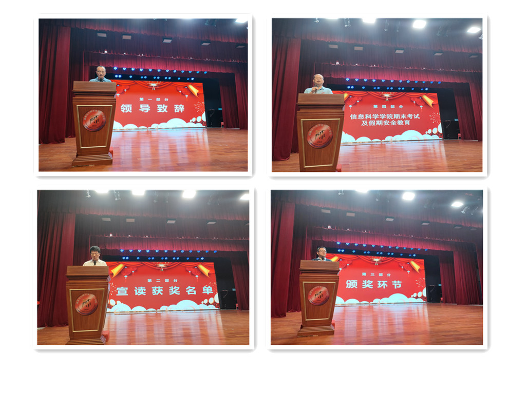 6月15日晚,信息科学学院在大礼堂隆重举行期末表彰大会,获奖同学一一上台领奖,院领导、教研室主任们为他们颁发了证书并合影留念。