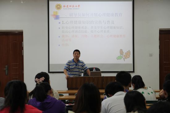 此次培训特邀福建师范大学心理健康指导中心张本钰主任就“如何开展心理健康教育”作专题讲座。张本钰主任结合自己从事多年大学生心理健康教育的工作经验,特别强调高校开展心理健康教育的重要意义并就高校如何进行心理健康教育体系建设进行详细阐述。他以精选的案例做导引,让大家在个案例中发现规律,学习如何判断大学生心理是否健康。张本钰主任从一个心理学工作者的角度,强调平等、激励、引导、启发原则的应用应当是现代教育管理者优于传统教育管理者的地方。最后,他以现场问答的方式结束了本次讲座。