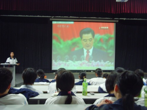 在近两个半小时的观看过程中,同学们聚精会神,专心致志的聆听锦涛同志作的报告。并在观看后,不少同学意犹未尽,展开了热烈的讨论。同学们纷纷表示,要在以后的学习生活中,努力拼搏,求是创新,开拓进取,要以实际行动为全面建成小康社会作出贡献自己的力量。