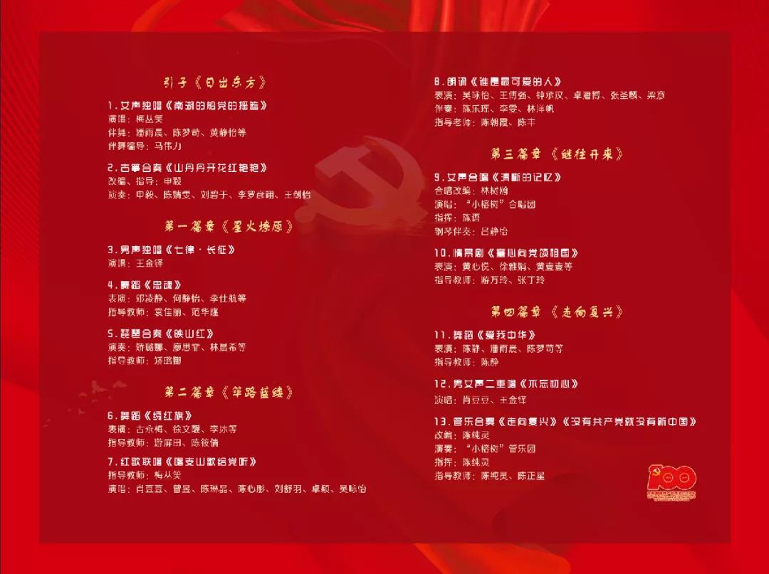 演出内容由引子《日出东方》、第一篇章《星火燎原》、第二篇章《筚路蓝缕》、第三篇章《继往开来》、第四篇章《走向复兴》等五个部分组成,13个精彩纷呈的节目由艺术教育学院选送9个,学前教育学院、通识教育学院、附属第一、第二幼儿园各选送1个节目组成,围绕着党的奋进百年路展开。演出从我院梅丛笑副教授的独唱《南湖的船党的摇篮》开启,在全场师生高唱《没有共产党就没有新中国》的激昂歌声中圆满结束。