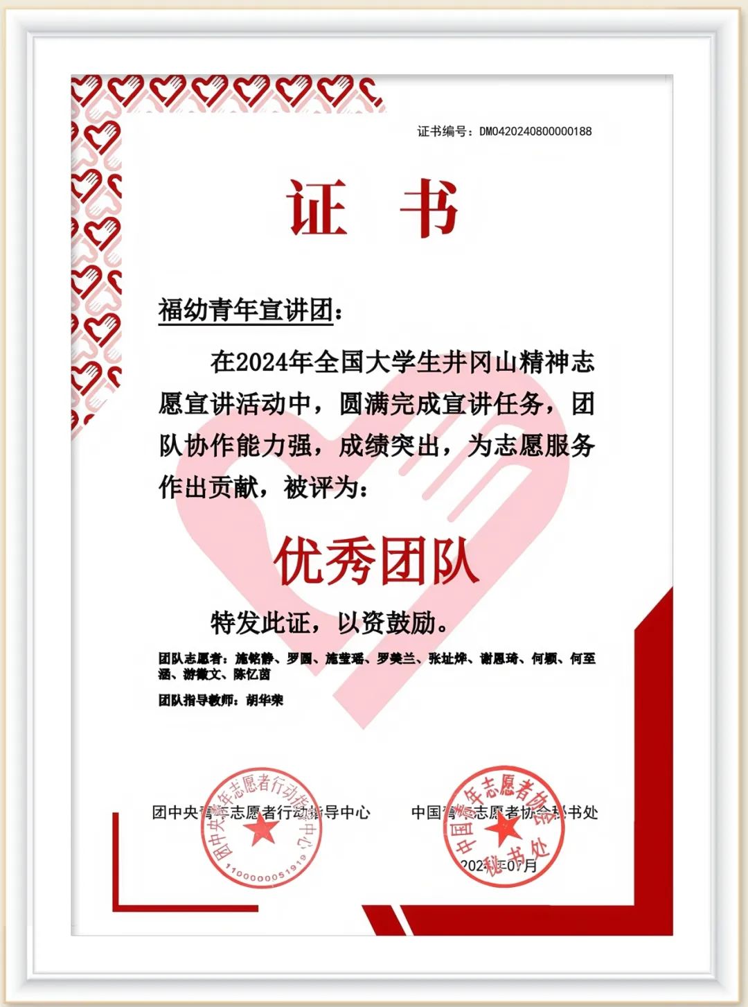 近日,团中央青年志愿者行动指导中心公布2024年全国大学生井冈山精神志愿宣讲活动评选结果。福幼青年宣讲团圆满完成宣讲任务,成绩突出,被评为全国优秀团队!