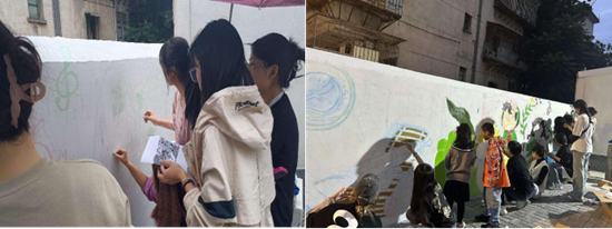 在做好必要的准备工作后,党员们按照分组有条不紊地开展墙绘内容。勾勒线条、色彩填涂、细节塑造,党员们以墙为布将校园墙面变身户外美育新课堂,互帮互助、团结协作,充分彰显了学前教育学院学生第三党支部的凝聚力和向心力。墙绘的设计充分贴合小柳小学"柳文化",展现了学校"一树春风千万枝、嫩于金色软于丝"的蓬勃、圆融之柔美以及"千磨万击还坚劲"的韧性之美。学生党员们生动细致的描绘引得邻里街坊纷纷前来围观。
