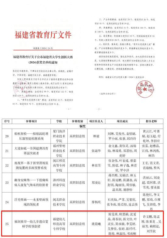 近日,经过大赛专家委员会评审、组织委员会审定,福建省大学生创新大赛(2024)职教赛道暨第八届黄炎培海峡职业教育创新创业大赛获奖名单公布。学前教育学院选送的项目《福润童印——幼儿非遗启蒙研学的领创者》在众多优秀项目中脱颖而出,荣获职教赛道铜奖。