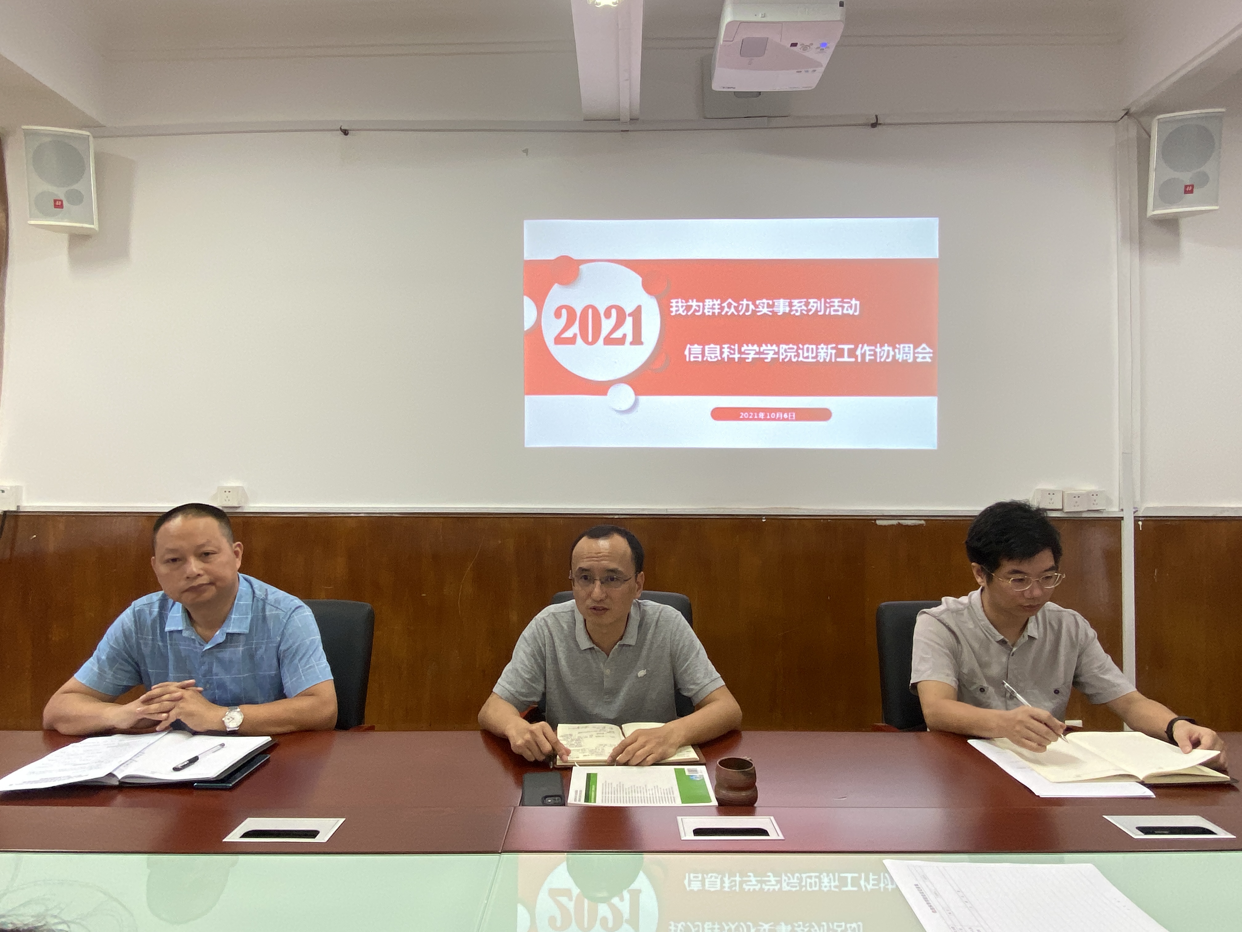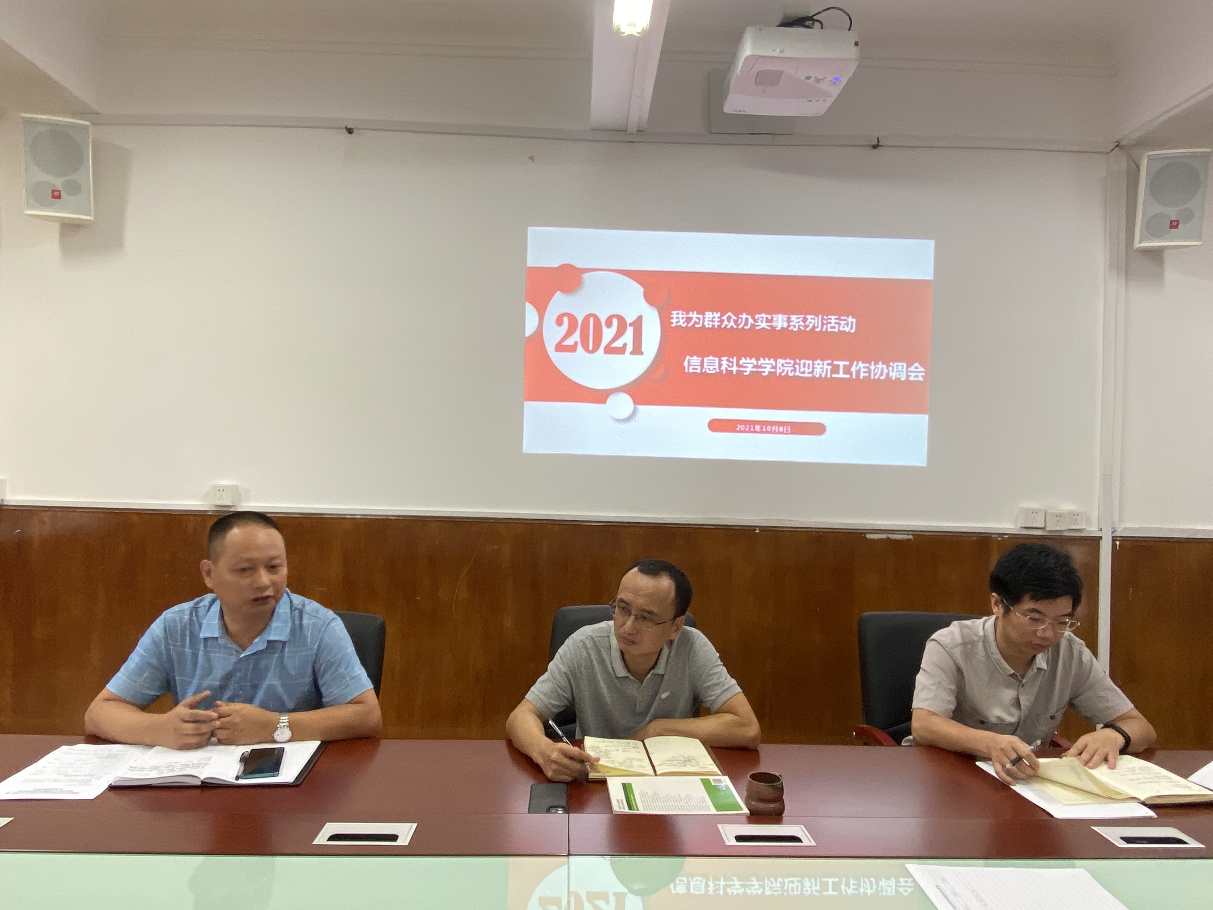 为切实做好2021级新生迎新工作,确保新生顺利入学,信息科学学院于10月6日下午在院部306会议室召开迎新工作部署会议。陈宁华院长、党总支余深焰书记、教研室主任、新生班主任、辅导员共同参加。