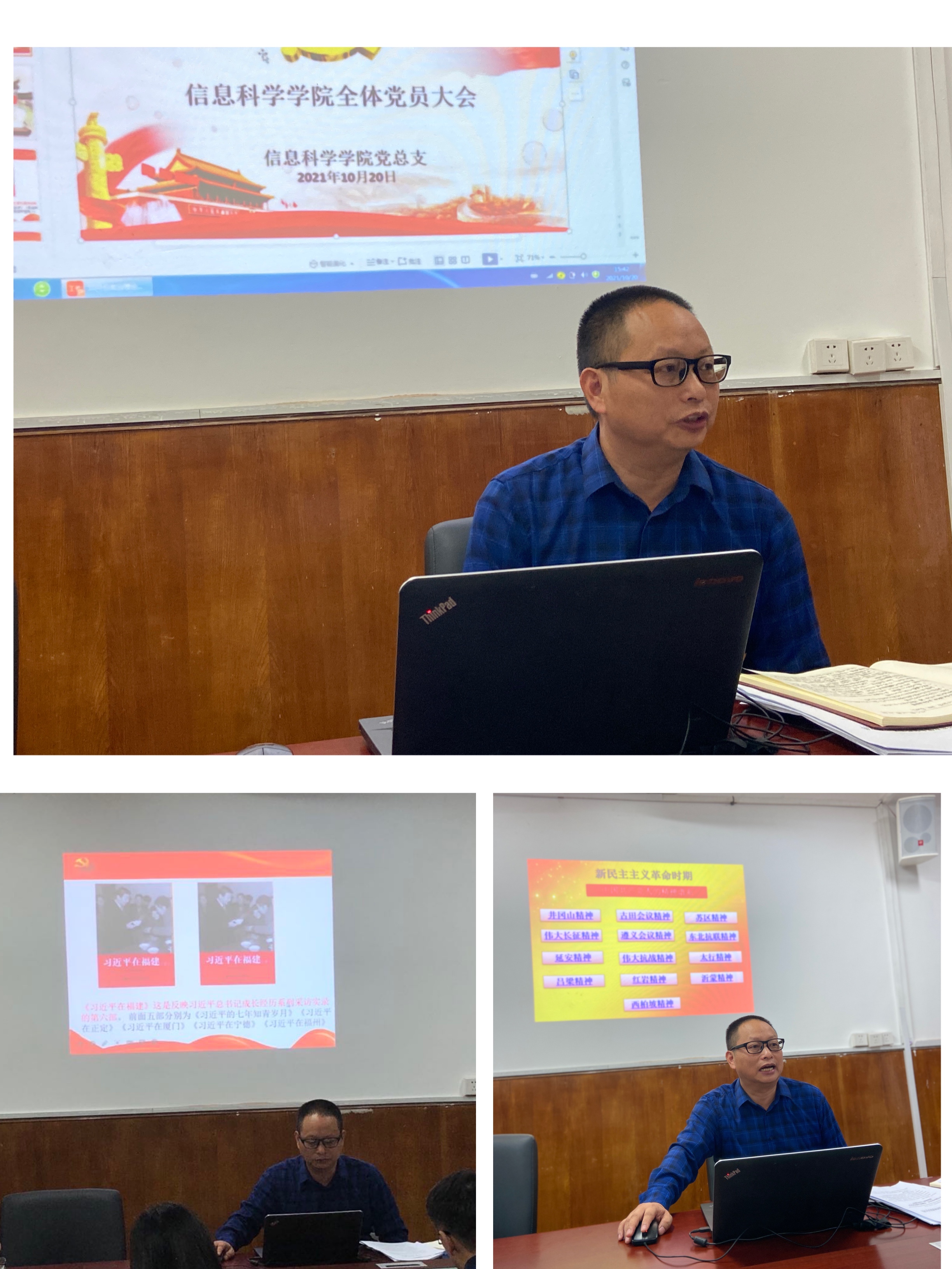 会上,余深焰书记首先传达了校党委《关于同意信息科学学院党总支召开党员大会的批复》等文件精神,就前期已征求学院多数党员意见并经学院党政联席会研究通过的第一届党总支委员候选人初步人选征求全体党员意见。接着组织学习《习近平在福建》《习近平总书记在纪念辛亥革命110周年大会上的讲话》,强调要学思想,守初心,铸忠诚,作表率,担使命。最后,余深焰书记做了题为《深入学习中国共产党人精神谱系》的党课分享。他指出,中国共产党精神谱系是立党兴党强党的精神维系,中国共产党人的精神之源。一百年来,中国共产党弘扬伟大建党精神,在长期奋斗中构建起中国共产党人的精神谱系,锤炼出鲜明的政治品格。历史川流不息,精神代代相传。我们要继续弘弘扬光荣传统、赓续红色血脉,永远把伟大建党精神继承下去,发扬光大!