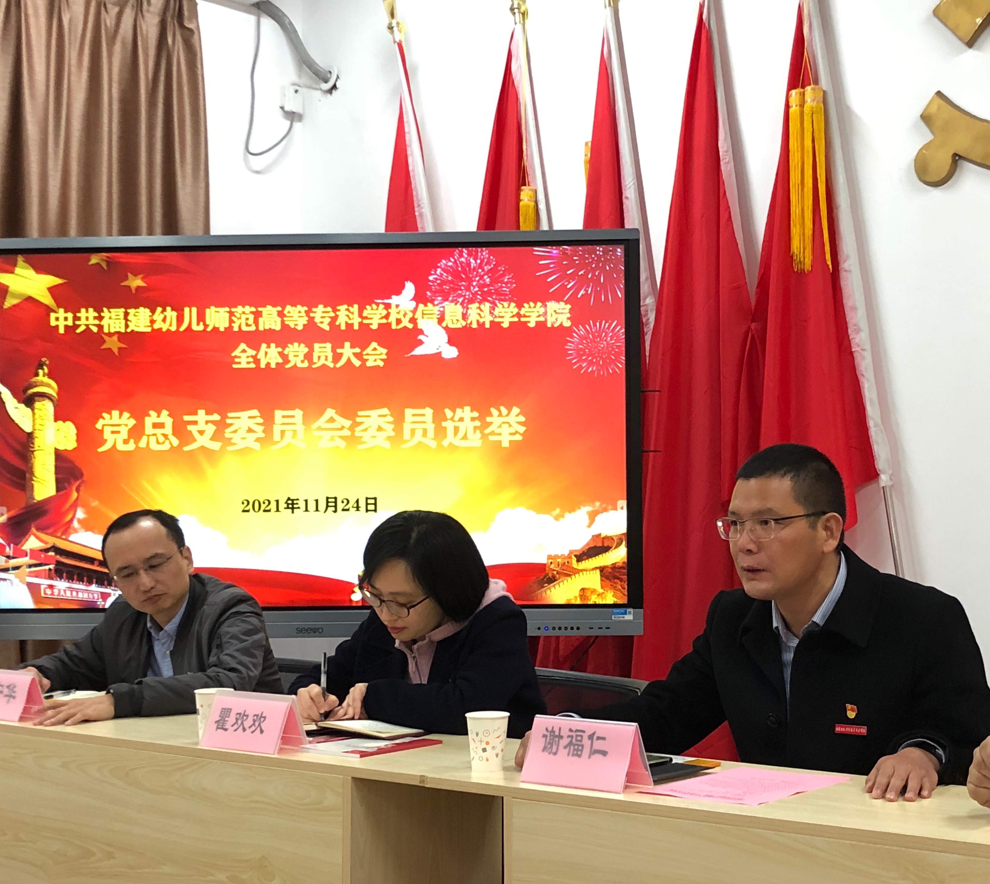 11月24日下午,信息科学学院党总支委员选举大会在行政楼215会议室顺利召开。校党委委员、副校长谢福仁,校组织统战部负责人瞿欢欢出席会议。信息科学学院24名党员参加大会,会议由余深焰书记主持。大会按规定程序选举产生了余深焰、陈宁华、刘建炜、林承杰、朱必熙等5名党总支委员。