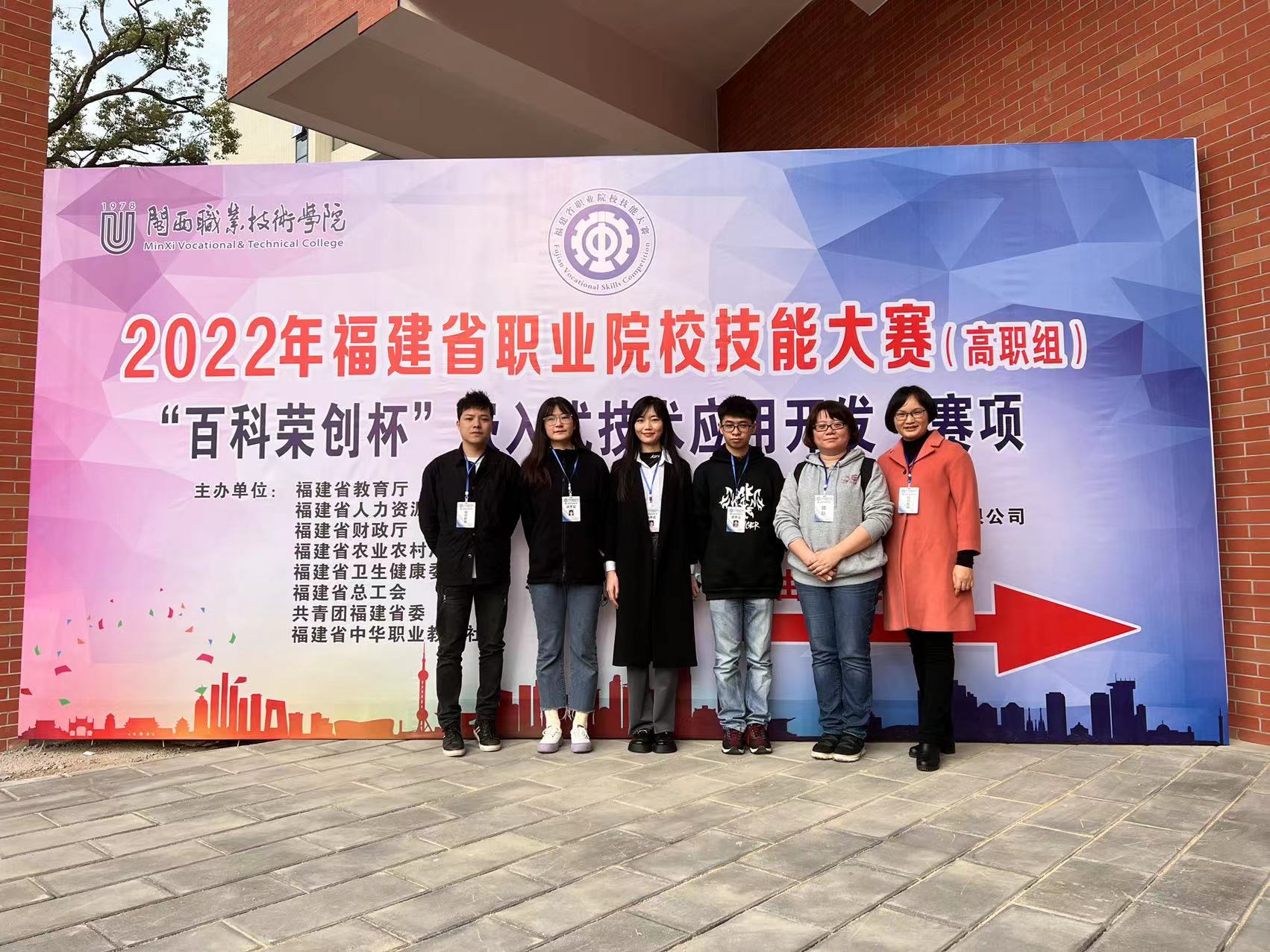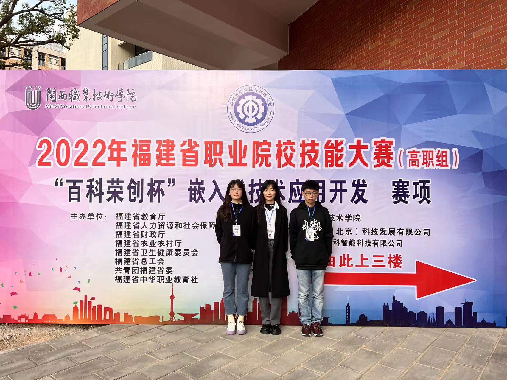 2022年福建省职业院校技能大赛高职组嵌入式应用开 发赛项于12月25日在闽西职业技术学院举行,信息科学学 院首次组队参赛,此次大赛共有来自全省15所高职院校共 17支队伍参加。信息科学学院参赛团队由林伟龙、林巧锋、徐依婷三位同学组成,在嵌入式技术应用教研室主任张淳老师和李明、施君泽老师的指导下,克服备赛时间少、参赛经验不足等因素,经过赛前刻苦集训,师生通力协作,最终荣获大赛三等奖,实现我校在该项赛事零的突破。本学期来,信息科学学院深入开展人才培养模式改革,突出"岗课赛证"融合创新,各项教育教学改革取得显著成效,人才培养质量稳步提升,努力实现更快速度、更高水平的发展。