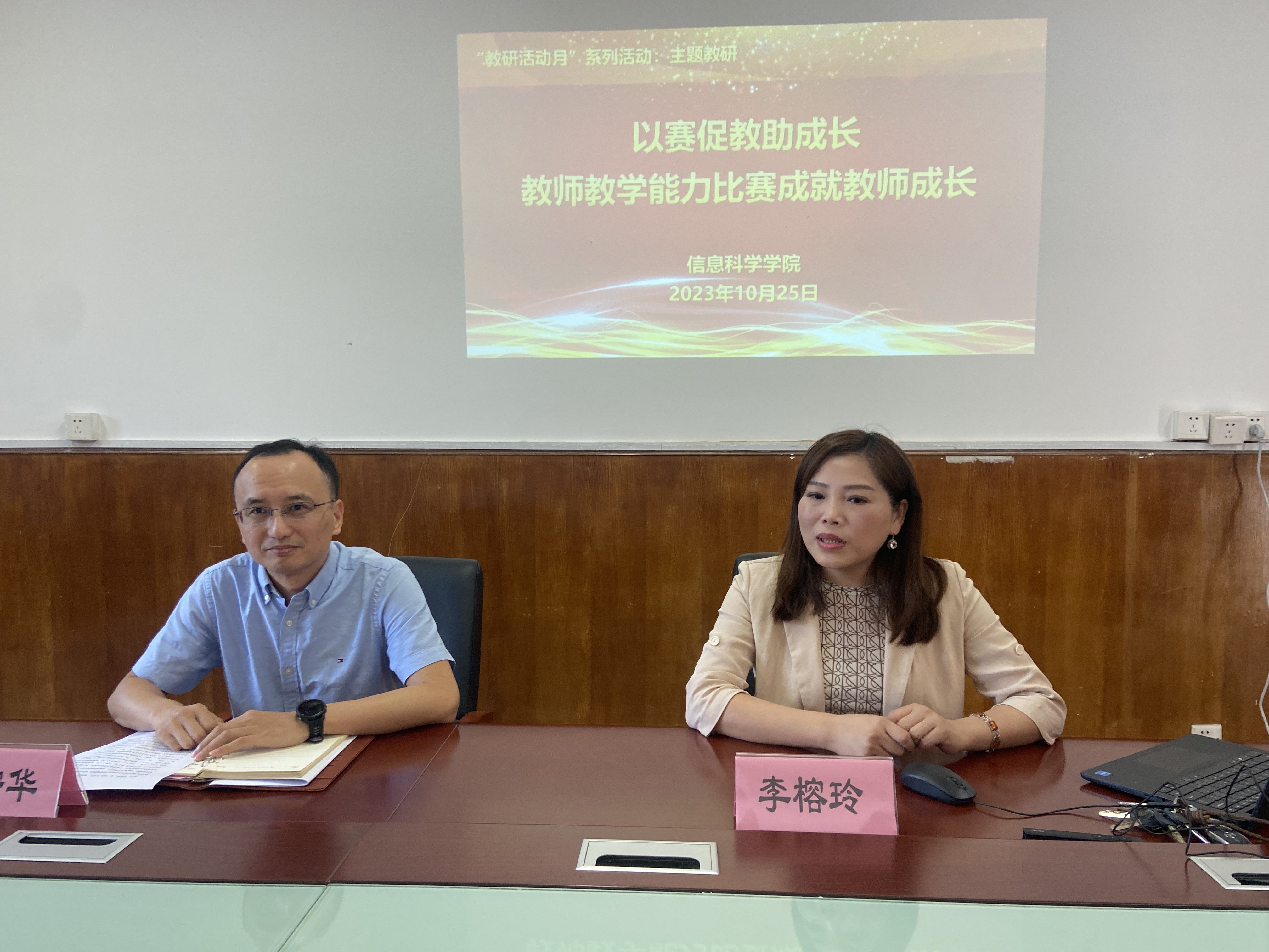 为深入贯彻党的二十大精神和习近平新时代中国特色社会主义思想,全面提升我院人才培养质量和教育教学水平,推动学院新阶段高质量发展,我院全面启动"教研活动月"各项活动。10月25日下午,学院组织开展了"以赛促教助成长,教师教学能力比赛成就教师成长"为主题的研讨活动,邀请福州软件职业技术学院游戏产业学院院长李榕玲教授来我院开展专题报告和交流研讨,信息科学学院院领导班子、全体专任教师参加了研讨活动。