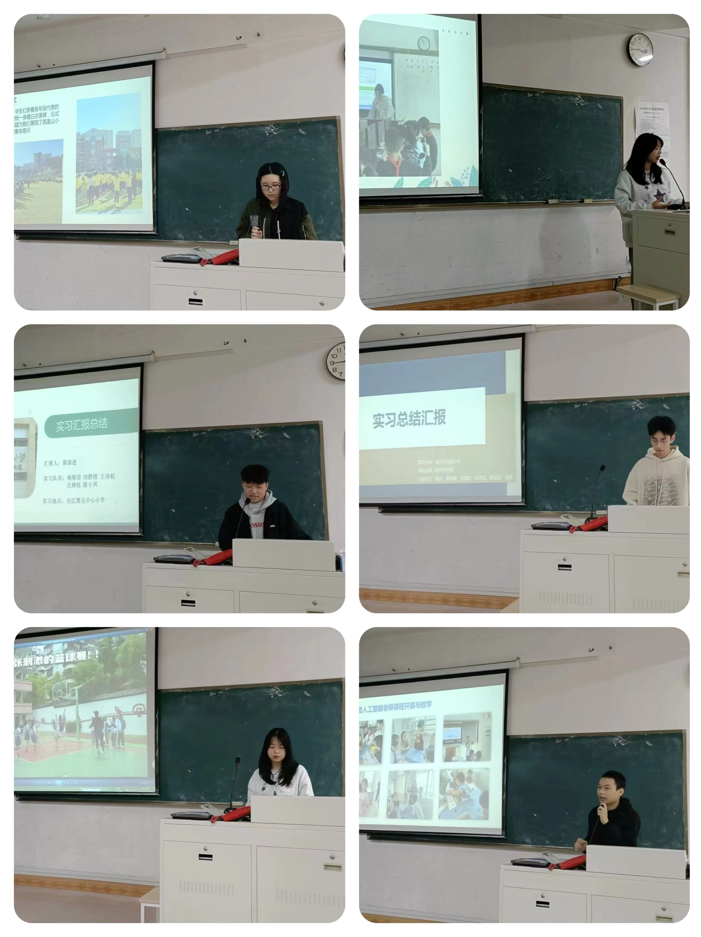 会上,福州市西峰小学、达明小学、台江区第五中心小学、亚峰中心小学、台江区教师进修学校附属第一小学、东升小学、高盖山小学等7支实习队进行了实习汇报,各队从日常礼仪、听课备课、班主任工作、课堂试讲、公开课等多个环节用图文并茂的方式进行了详细地阐述,并分享了实习过程中的宝贵经验,总结了各自的收获与得失。汇报结束后,现代教育技术教研室主任陈怀宇总结指出,通过教育实习能够将专业理论知识与实践相结合,达到知行合一、学以致用的目标,希望同学们能够认真总结、反思,用自己的行动践行一名老师的神圣与责任,朝着成为优秀人民教师的目标努力奋斗。